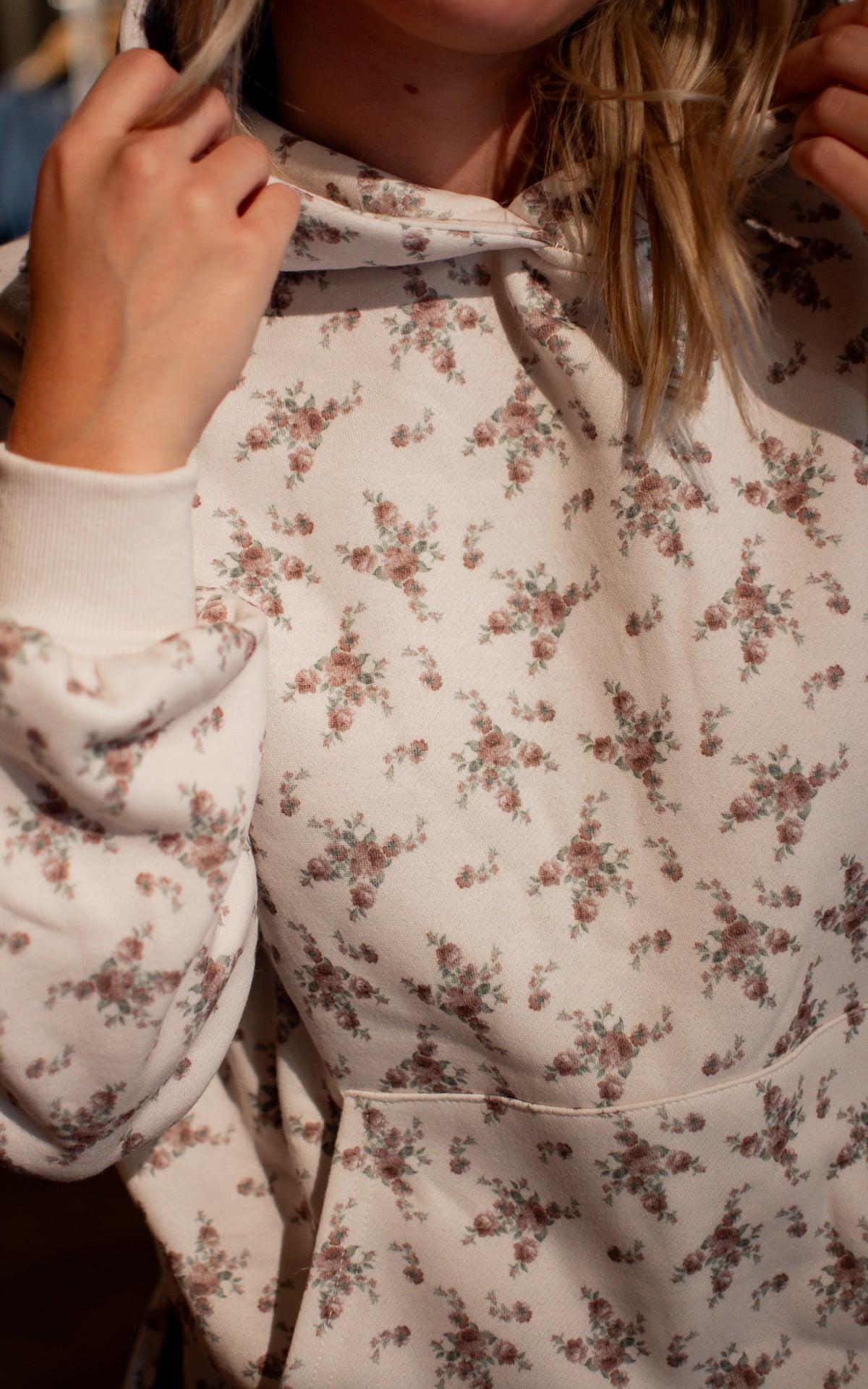 Cozy up in the Day Off Floral Hoodie, a playful cream sweatshirt adorned with charming floral prints. Perfect for fall, it pairs effortlessly with matching sweats sold separately to complete your laid-back, seasonal look.