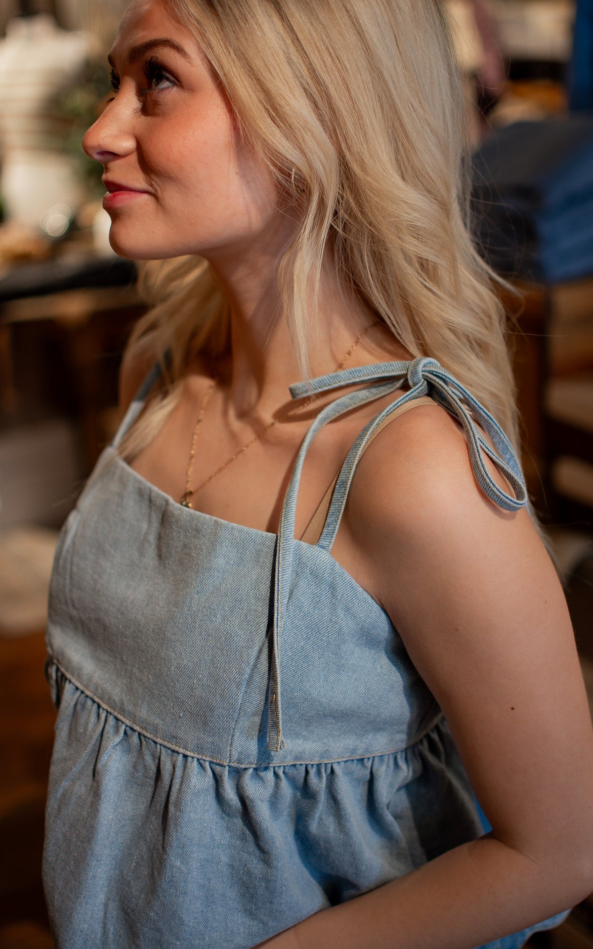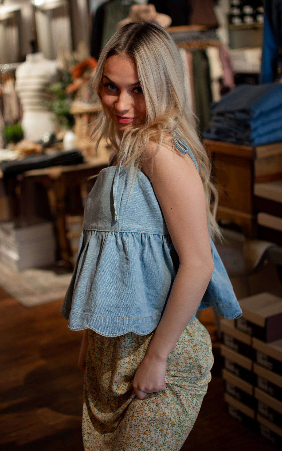 Get ready for summer with the Denny Peplum Tank Top. This flirty denim tank features tie straps and a back zipper for easy wear, along with darling scallop edging. Perfect for a fun and flirty look during the warmer months.