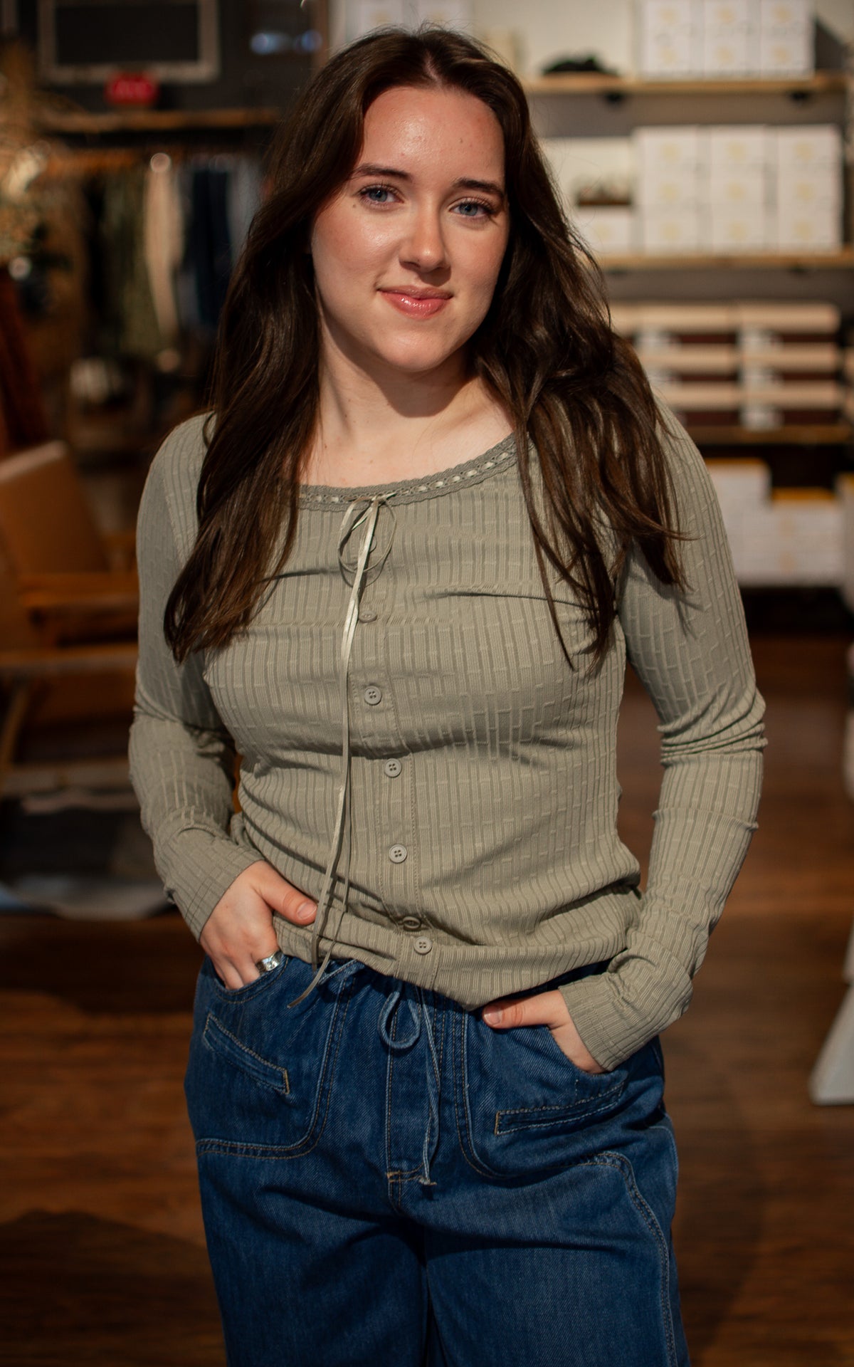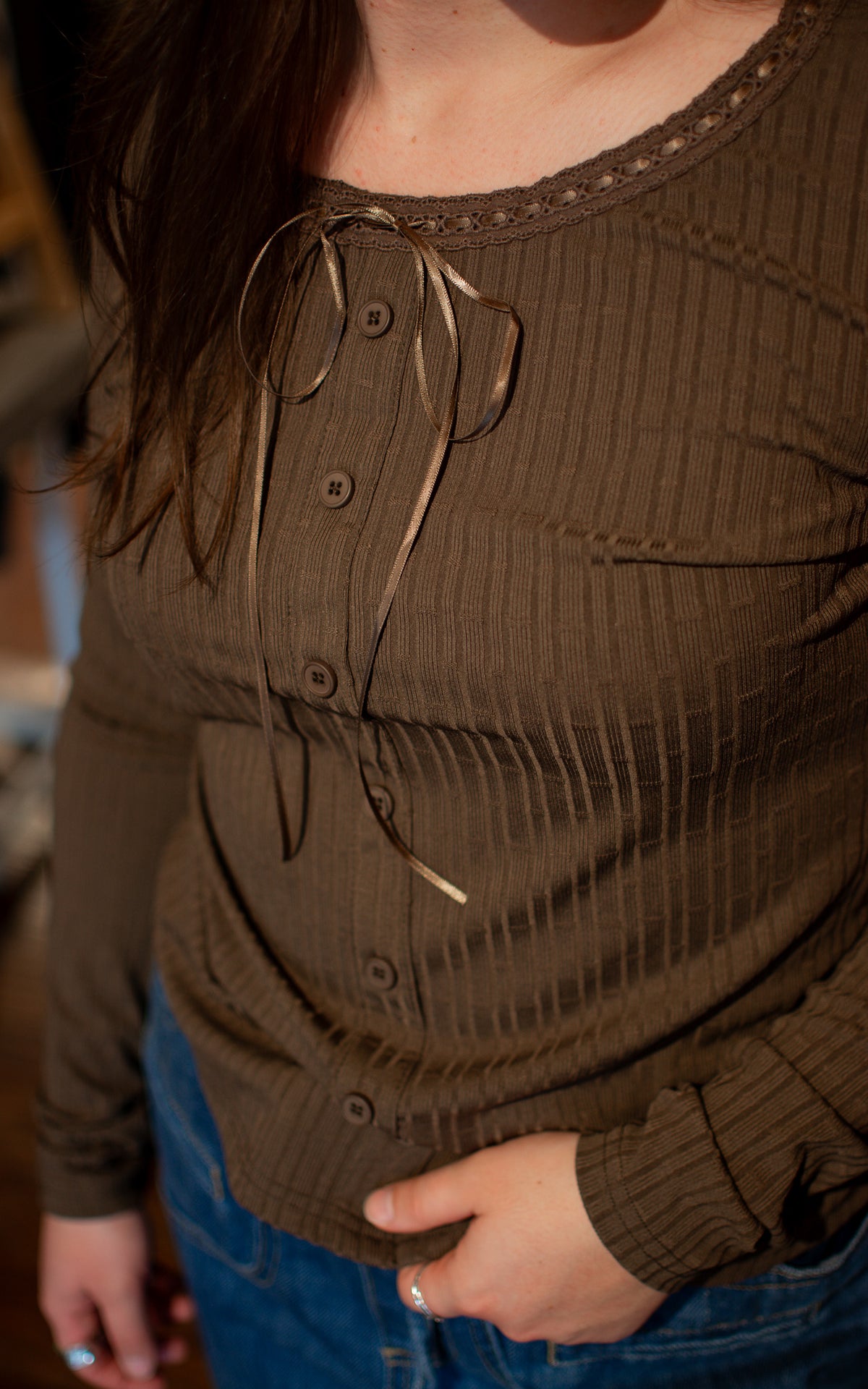 Twirl into comfort with the Fawn Ribbon Long Sleeve Top! Available in earthy brown or olive, this stretchy scoop-neck top features a playful ribbon tie at the neck, adding a sweet and flirty touch to your look. Perfect for cozy days with a sprinkle of charm.