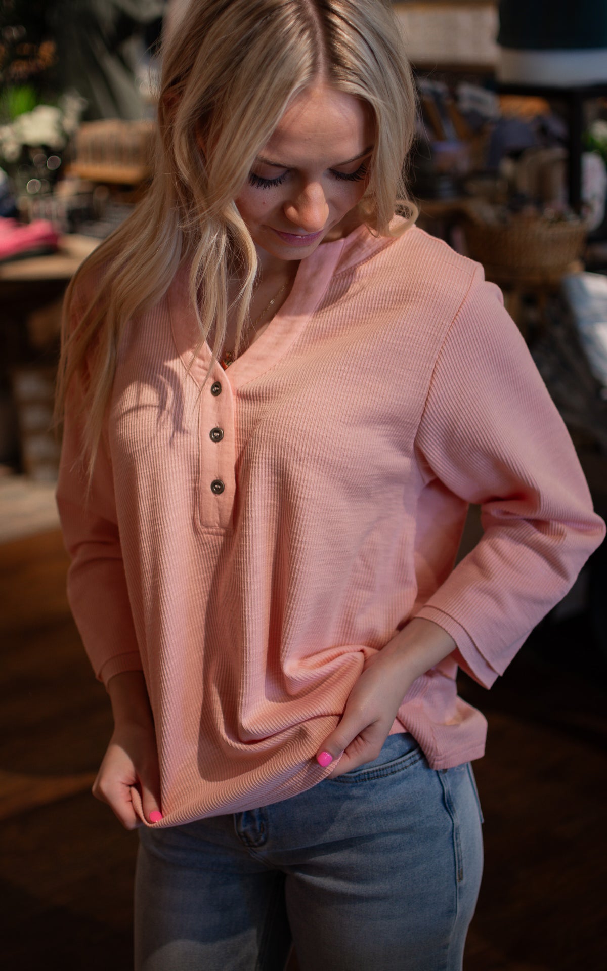 The Flatter Me Waffle Knit Top has got you covered for any occasion - from house chores to getting your hands dirty. With a flattering 3/4 sleeve length and an oversized comfort fit, it's the perfect combination of style and practicality. Plus, the light pink color adds a touch of femininity. Get yours now!