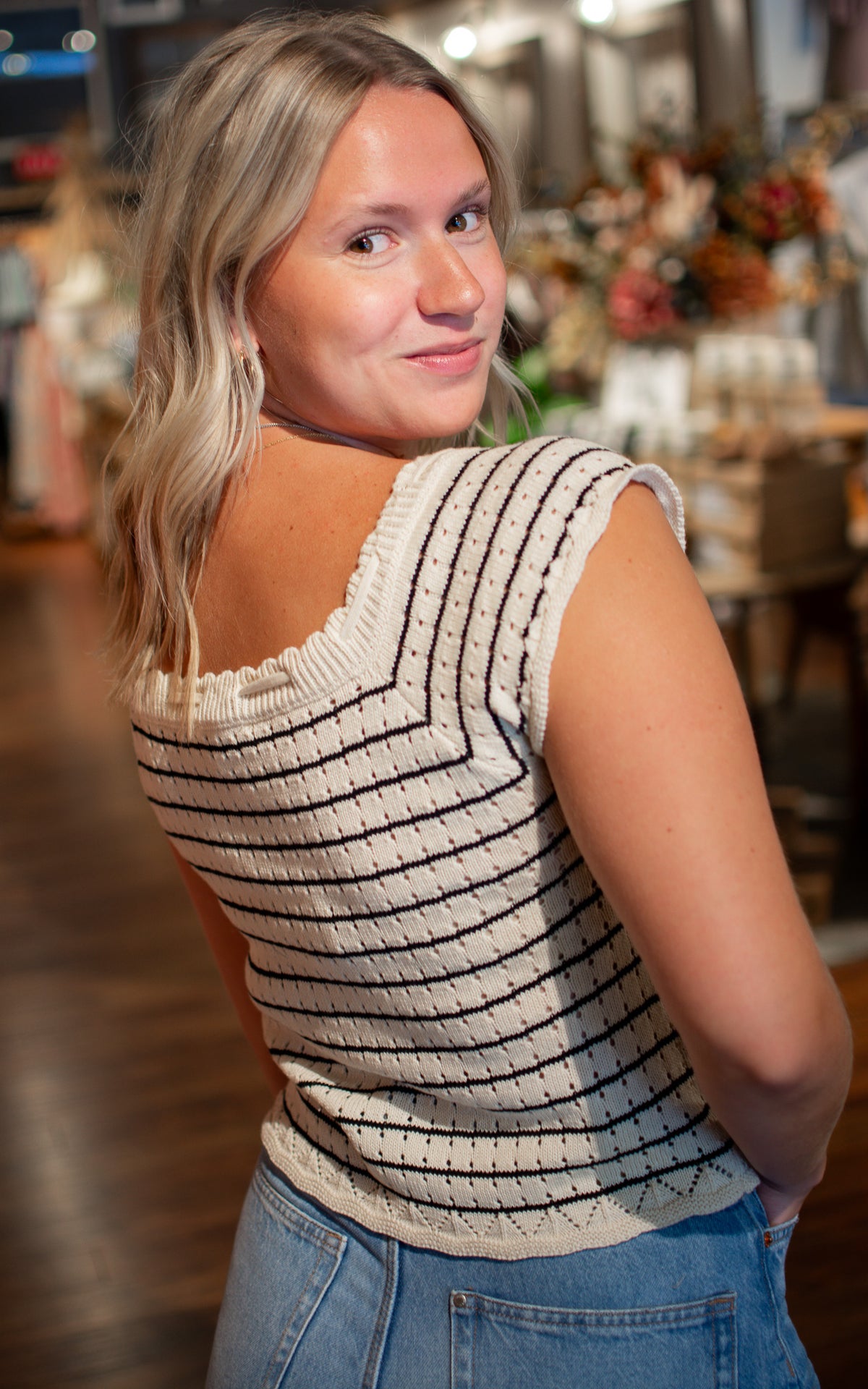 The French Press Knit Top offers a playful twist on classic style with its trendy square neck and bold black stripes. Perfect for adding a touch of chic fun to your everyday look, this top combines comfort and eye-catching design effortlessly.