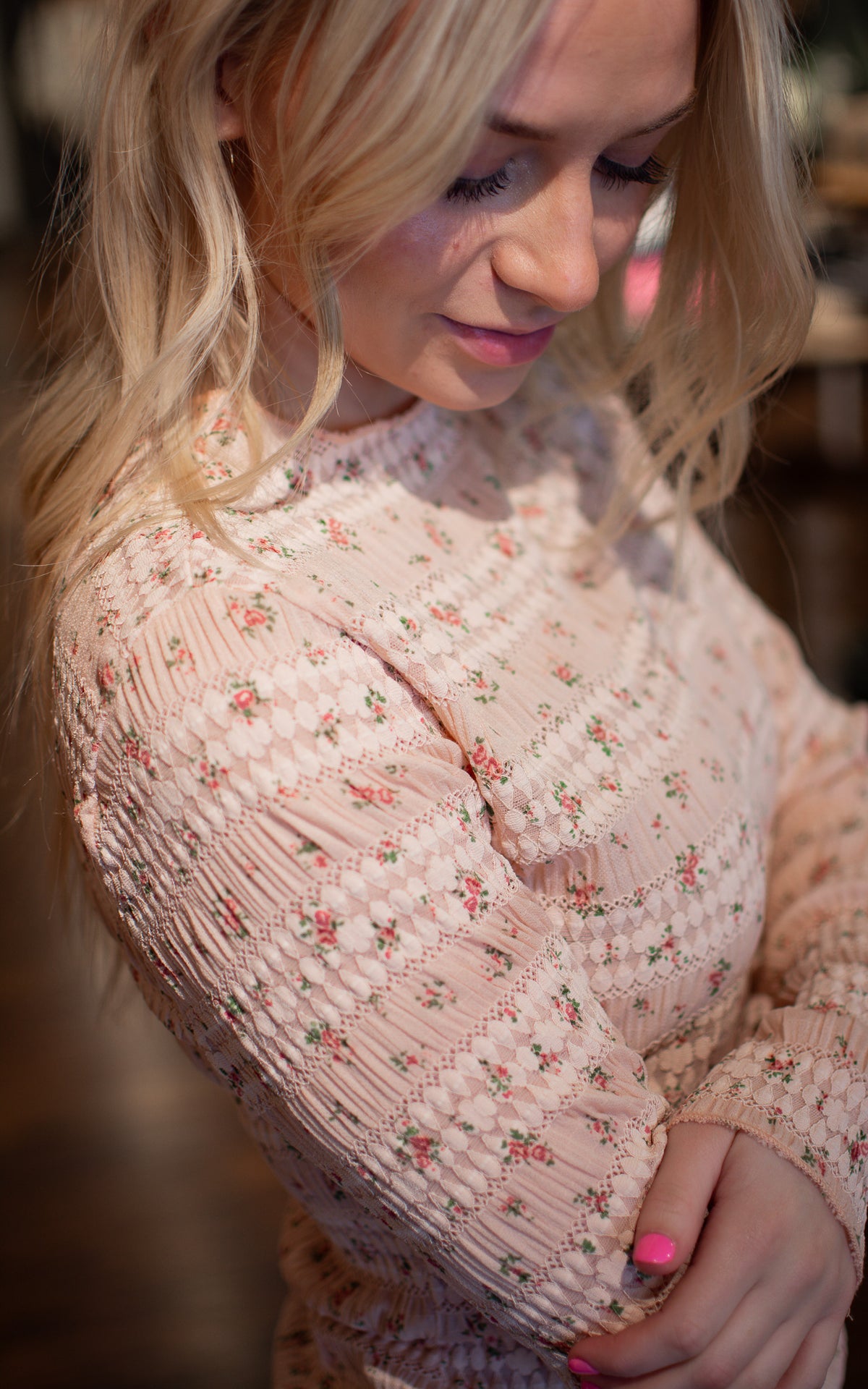 Indulge in sweet and playful style with Georgia's Peachy Top. Featuring the sweetest lace long sleeves and a semi-sheer eyelet lace design, this top is perfect for adding a touch of country charm to any outfit. The dark pinks and greens of the country floral print add a unique twist to this flirty and feminine top. (Peachy keen, don't you think?!)
