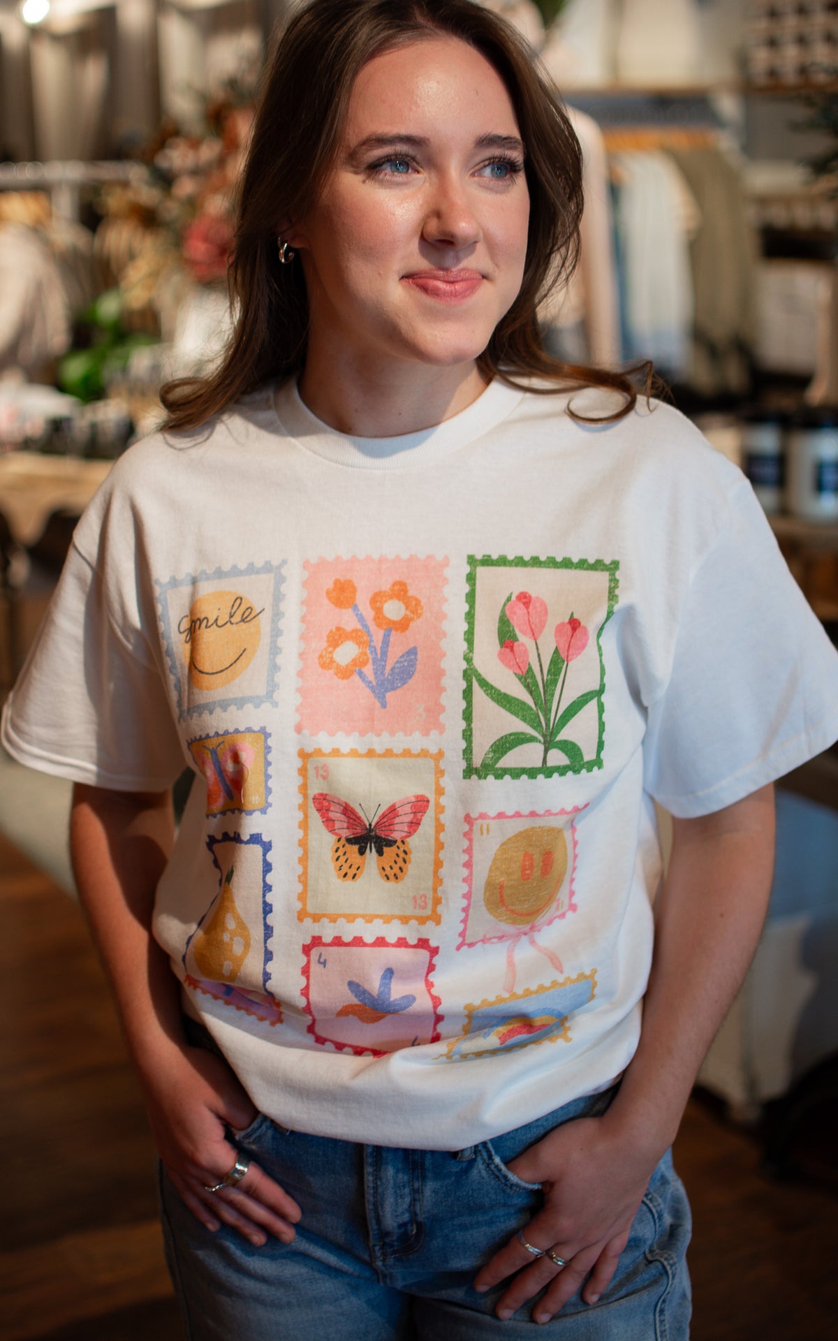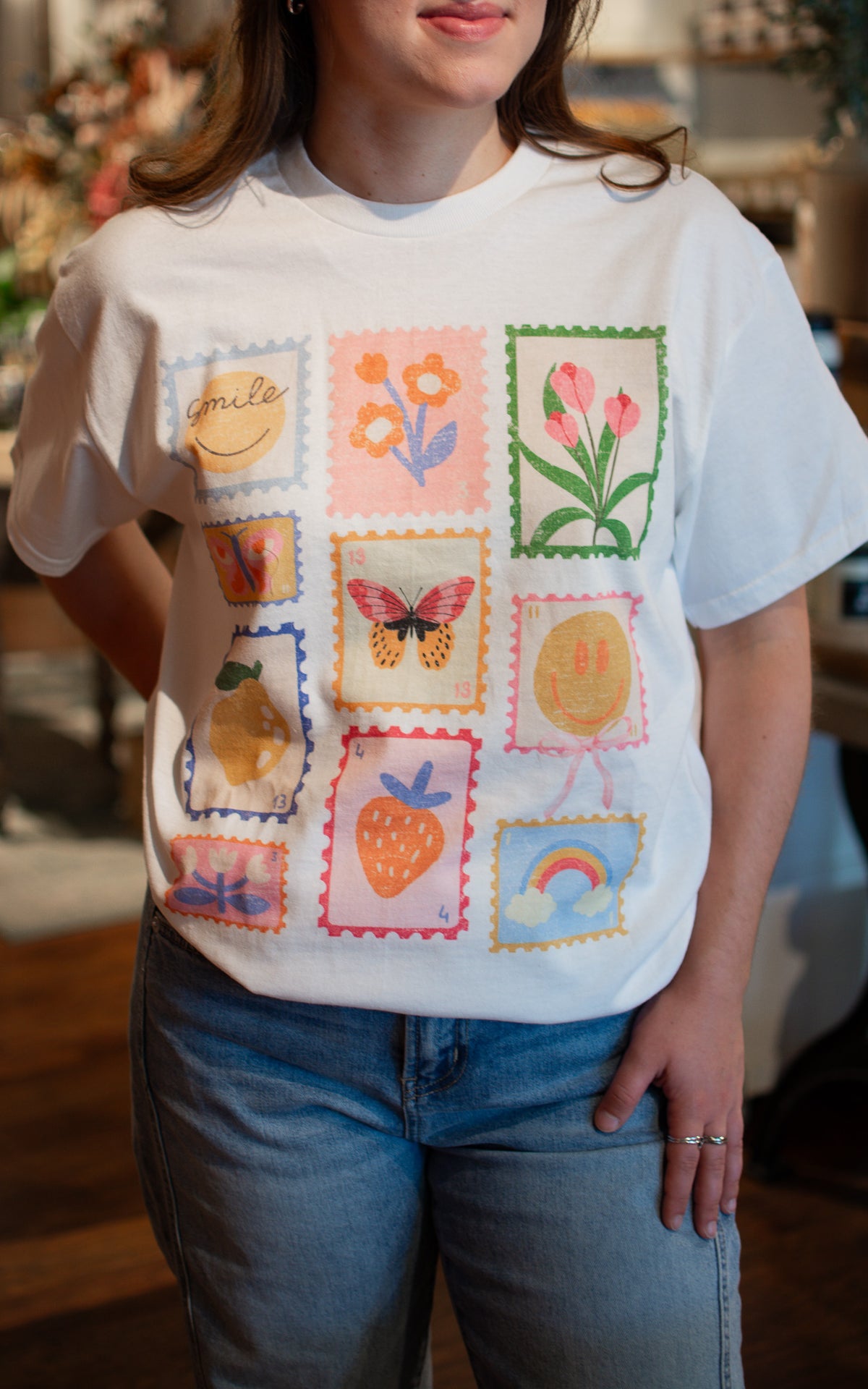 Bring on the sunshine with the Good Vibes Stamp Graphic Tee! This oversized boyfriend fit tee offers a relaxed, comfy feel perfect for summer days. Featuring darling, colorful graphics, it adds a playful pop to any outfit. Stay cool, casual, and full of good vibes wherever you go!