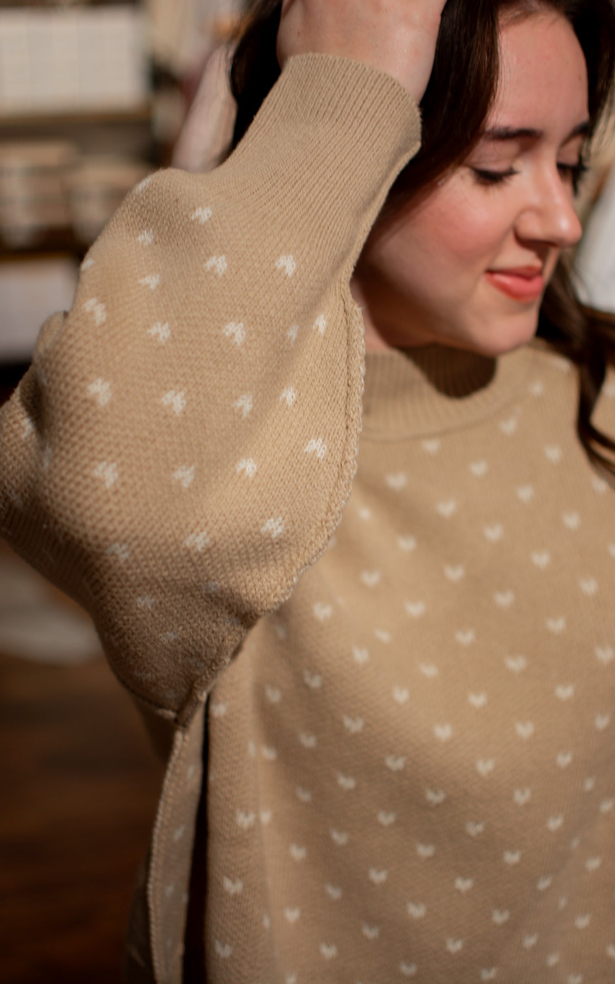 The Heart Song Twill Sweater brings festive charm with its cozy tan design dotted with white hearts or a bright white version featuring red hearts. Perfect for holiday gatherings and family photos, this sweater adds a playful touch to your seasonal wardrobe while keeping you comfy and stylish. Celebrate love and togetherness in every stitch!