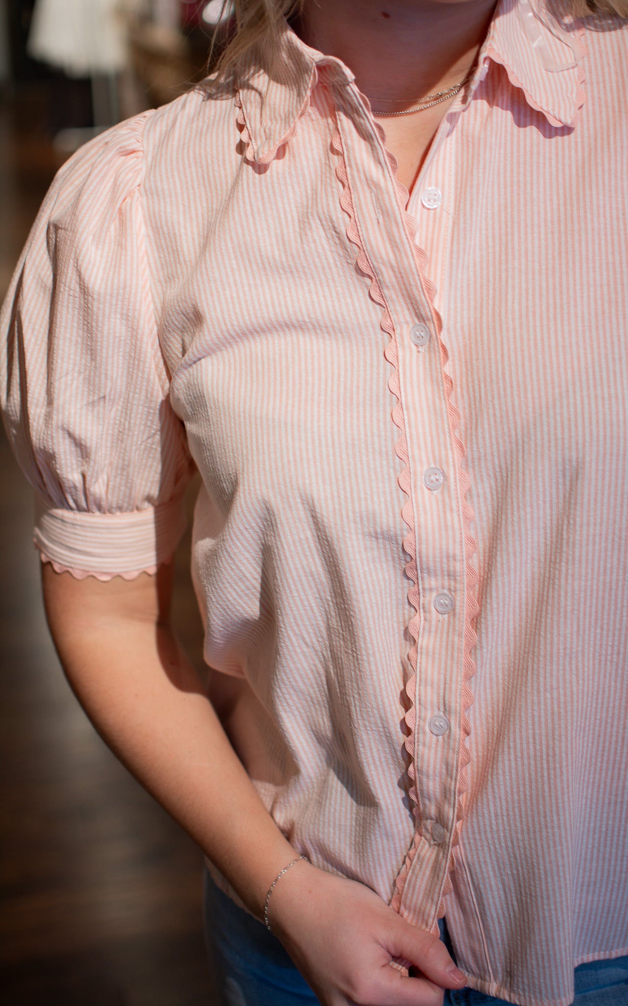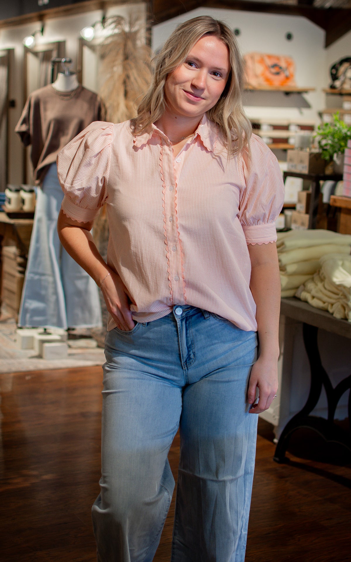High Noon Button Up Shirt features classic pink stripes with charming puff sleeves and a structured collar for a polished, vintage-inspired look. Perfect for layering or wearing solo, this versatile piece transitions seamlessly from casual weekends to dressed-up occasions. The button-up design offers easy styling flexibility, while the feminine puff sleeves add a touch of elegance to any wardrobe.