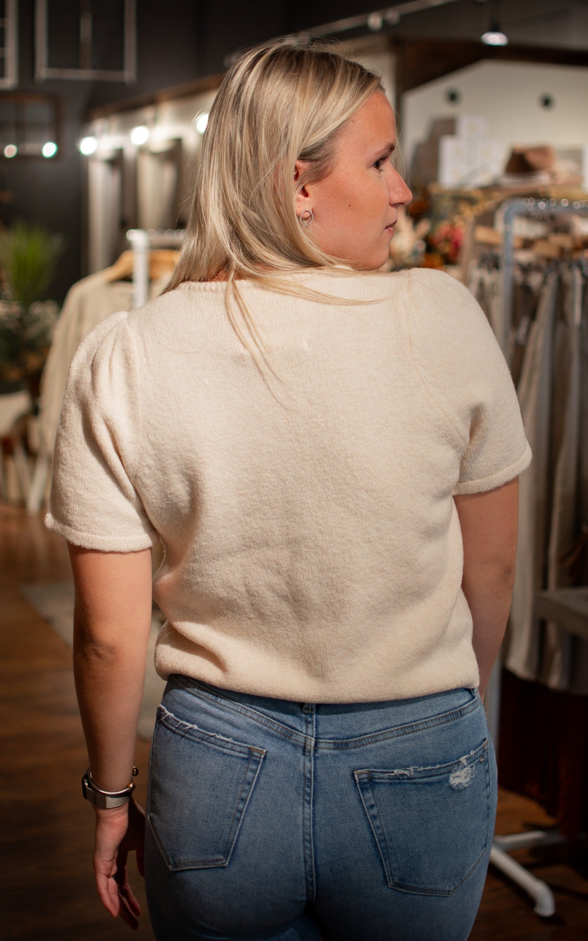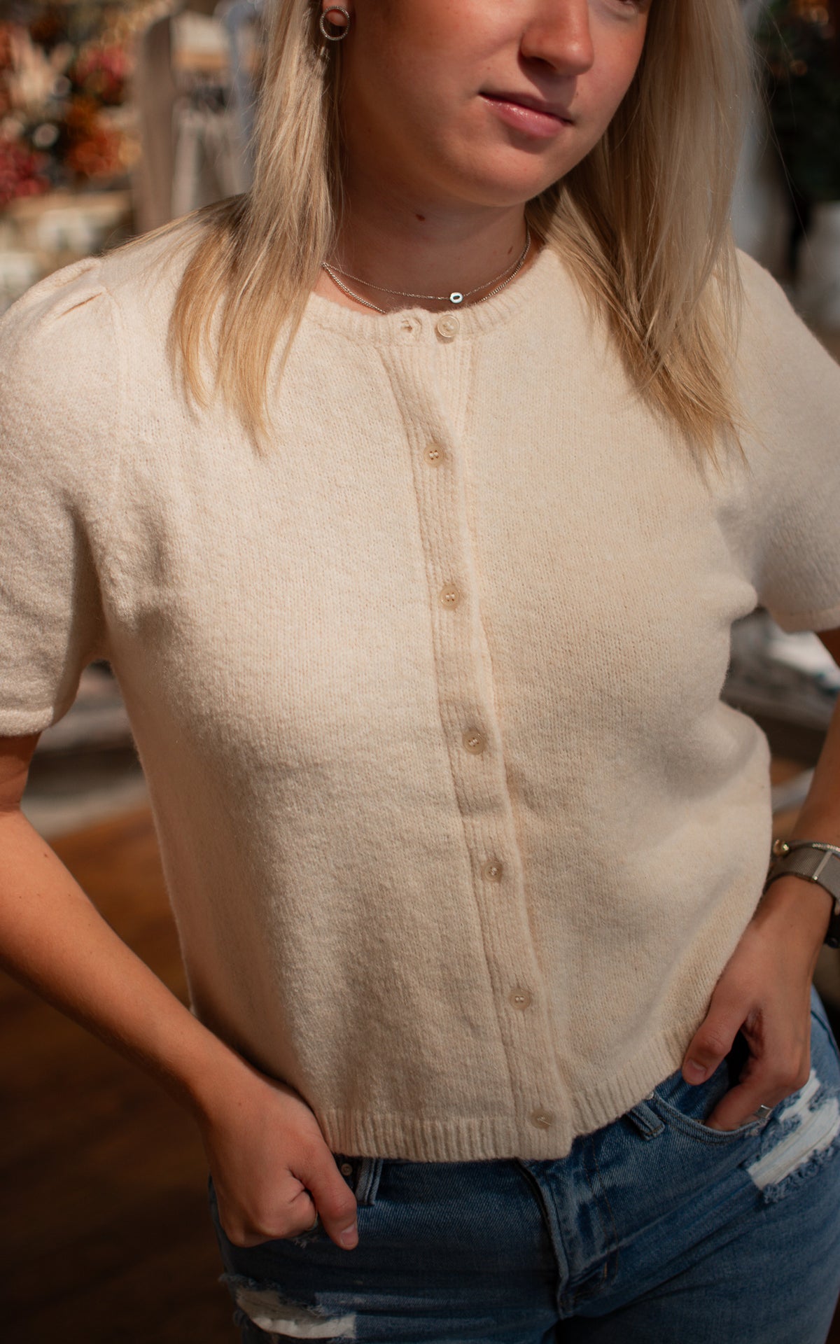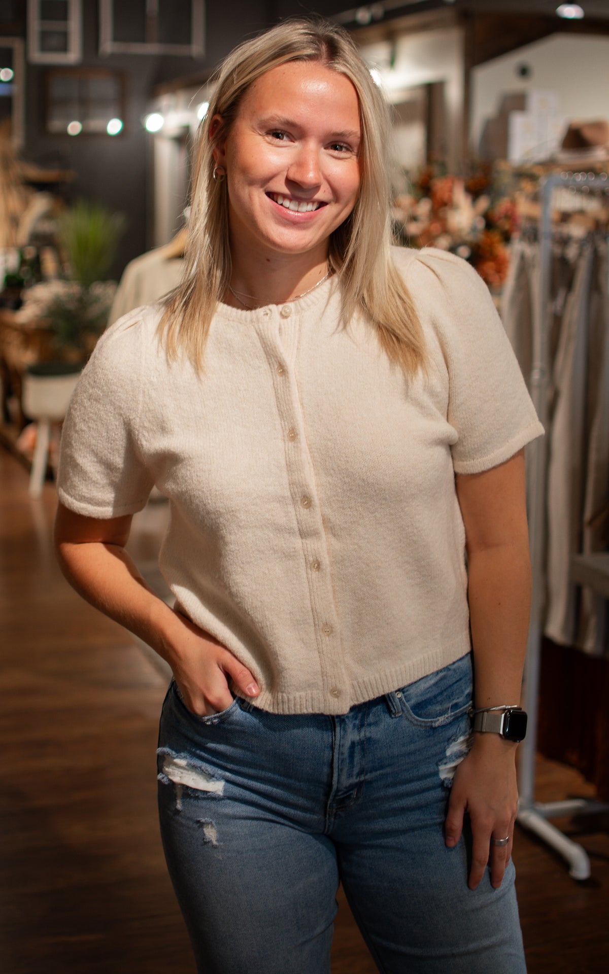 Meet your summer-to-fall must-have: the Librarian Button Sweater! This cream-colored, short-sleeve cardigan is perfect for layering with a playful vibe. Button it up for a cozy, charming look that’s ready to carry you through every sunny day and crisp evening with style.