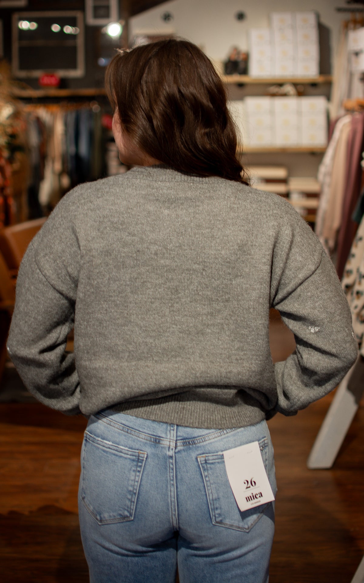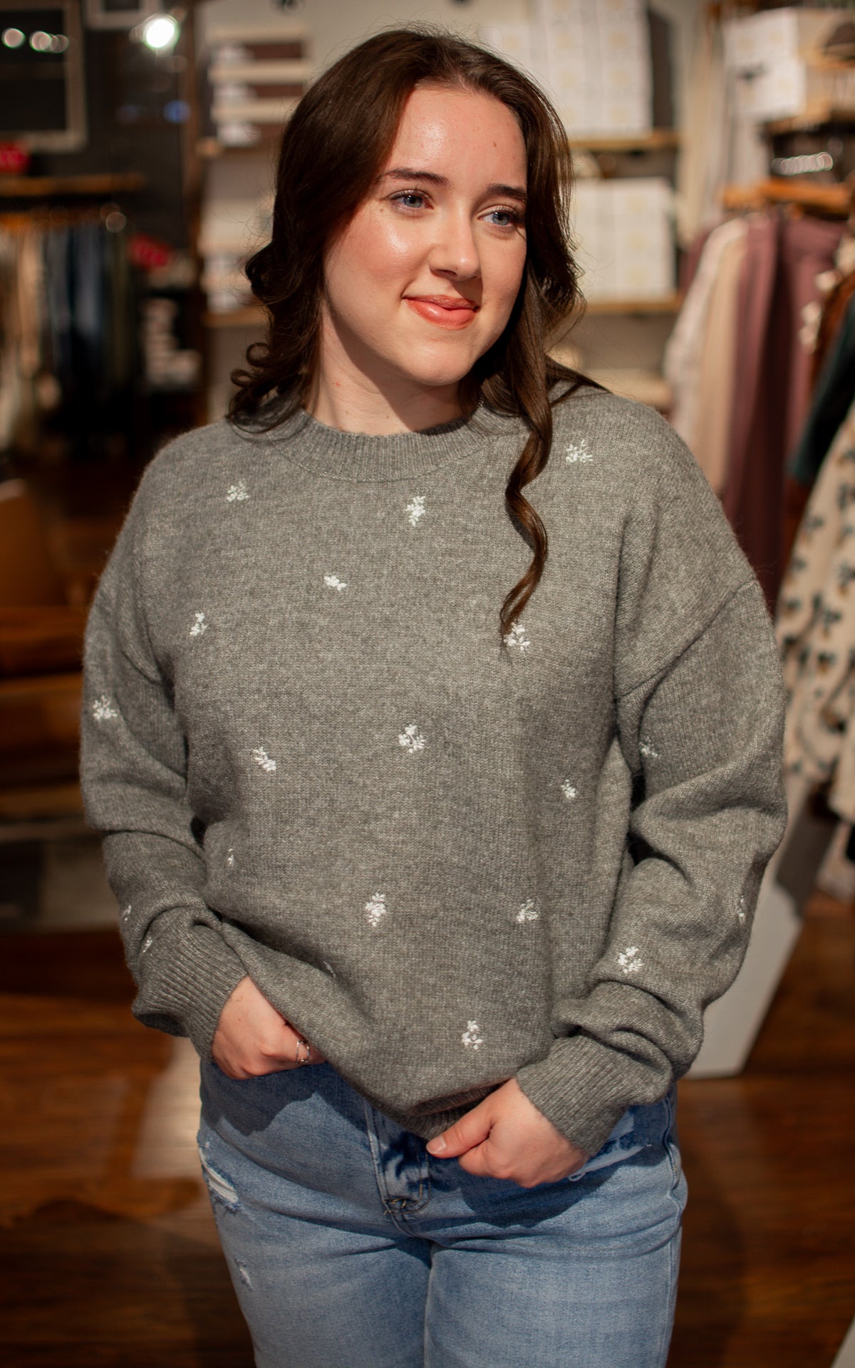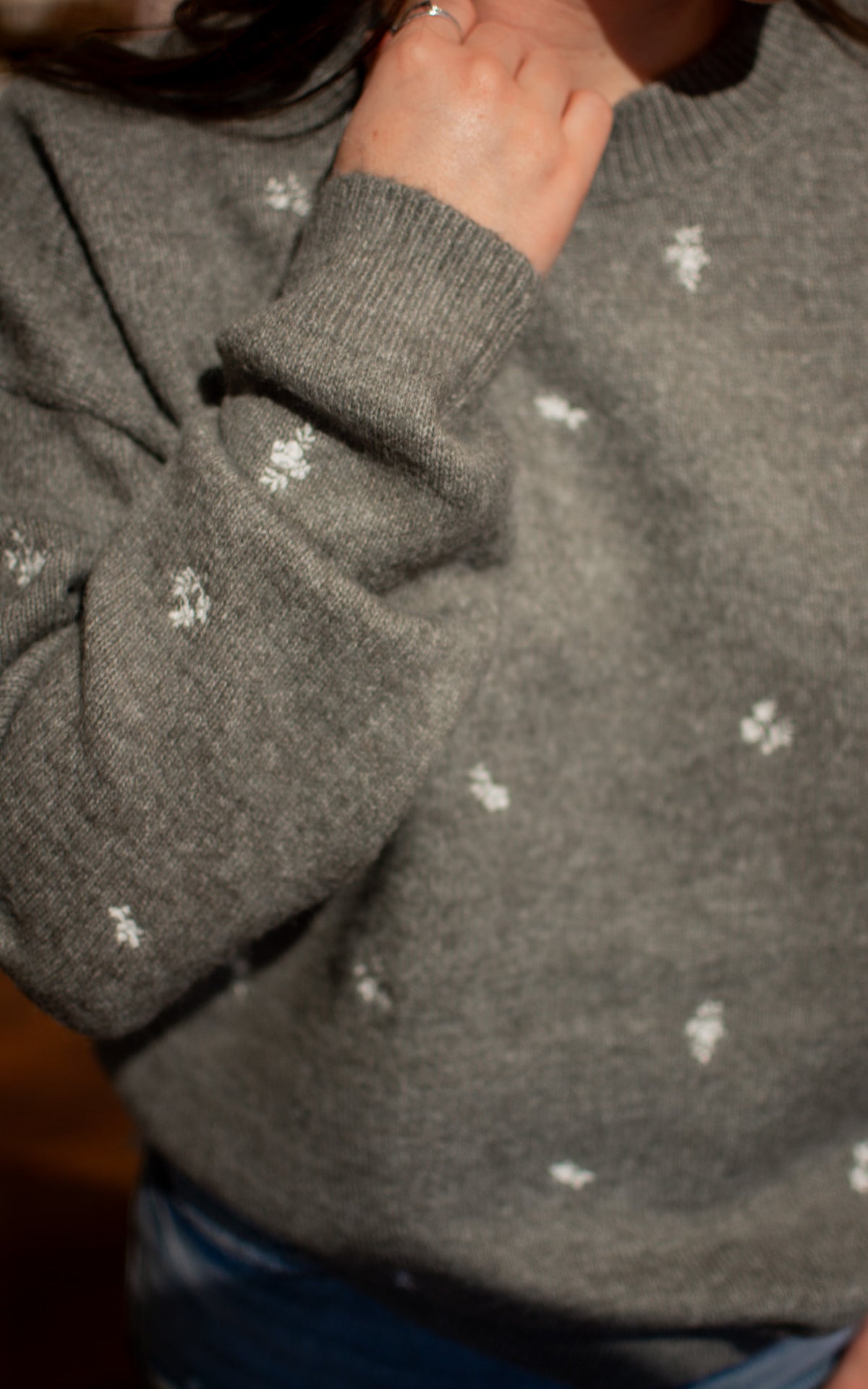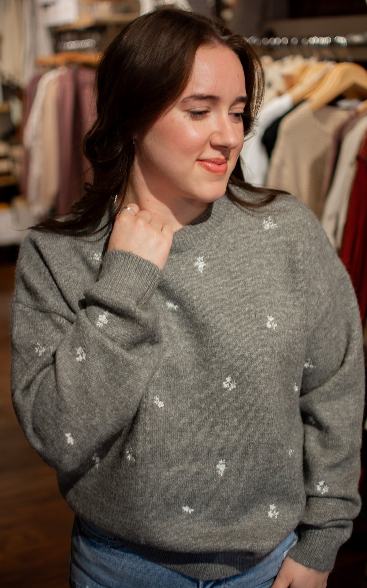 The Library Day Sweater in soft grey is a must-have with its charming white floral embroidery. This playful piece adds a fresh, cozy vibe to your outfit, perfect for curling up with a good book or brightening any day with a touch of floral fun.