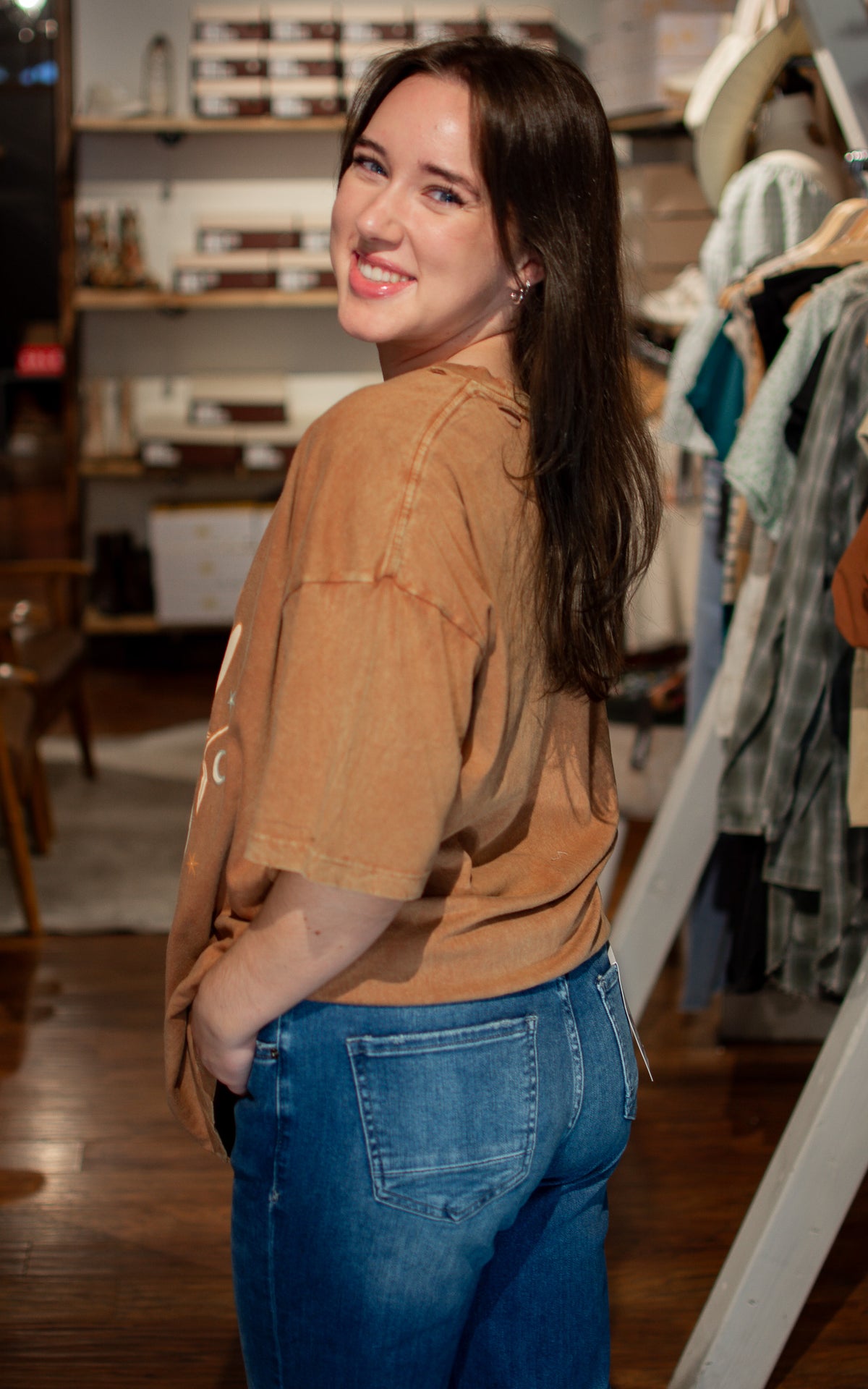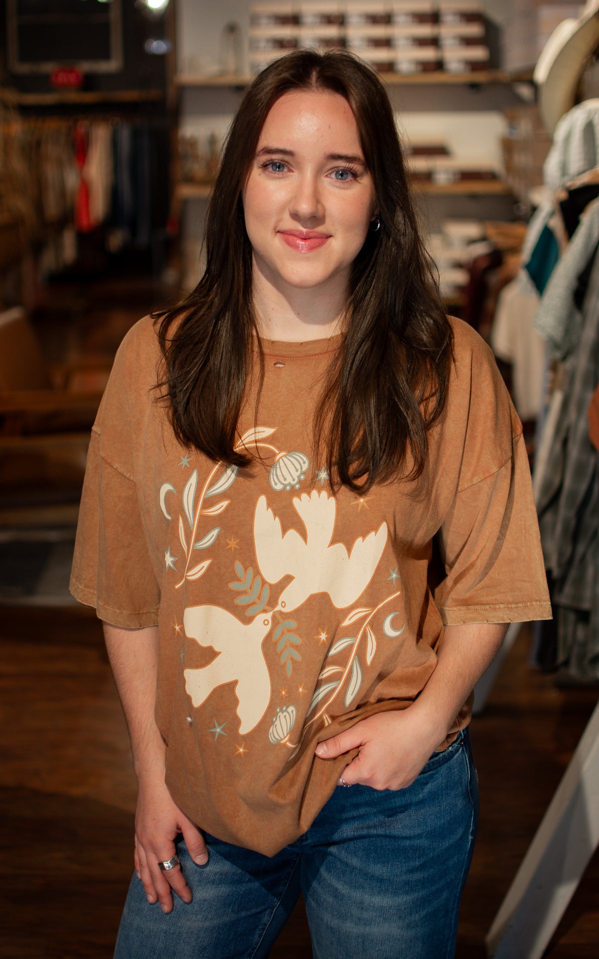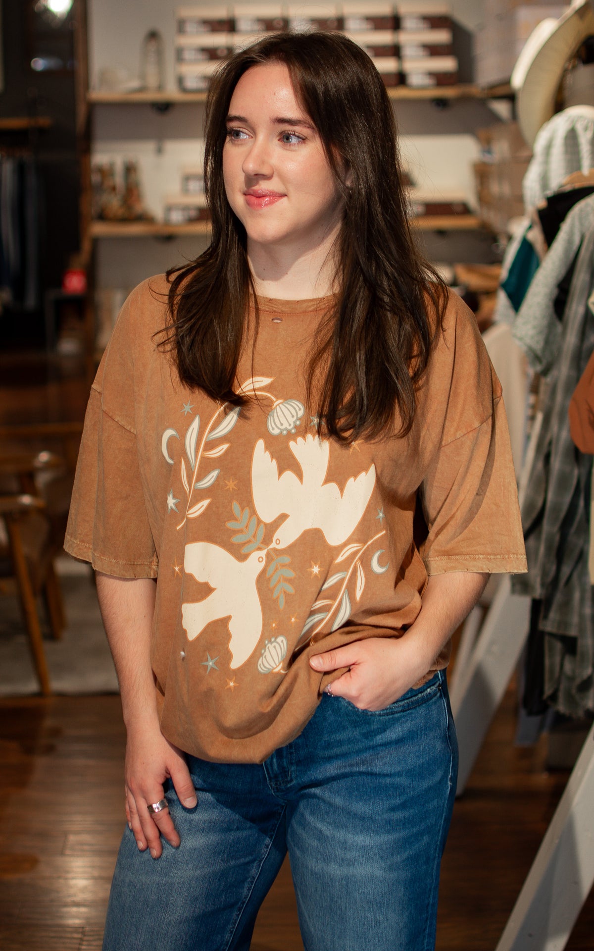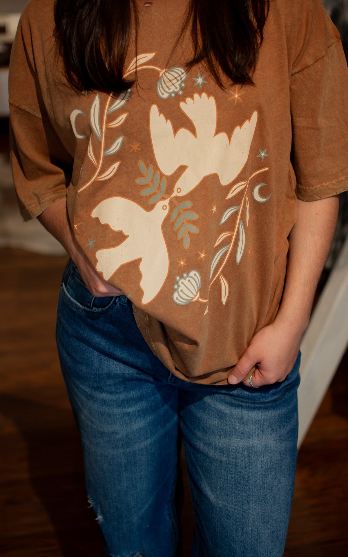 Amp up your casual vibe with the Little Dove Energy Tee. This oversized rust brown graphic tee brings playful energy and comfy coolness to your everyday look, perfect for mixing and matching with your favorite laid-back pieces.
