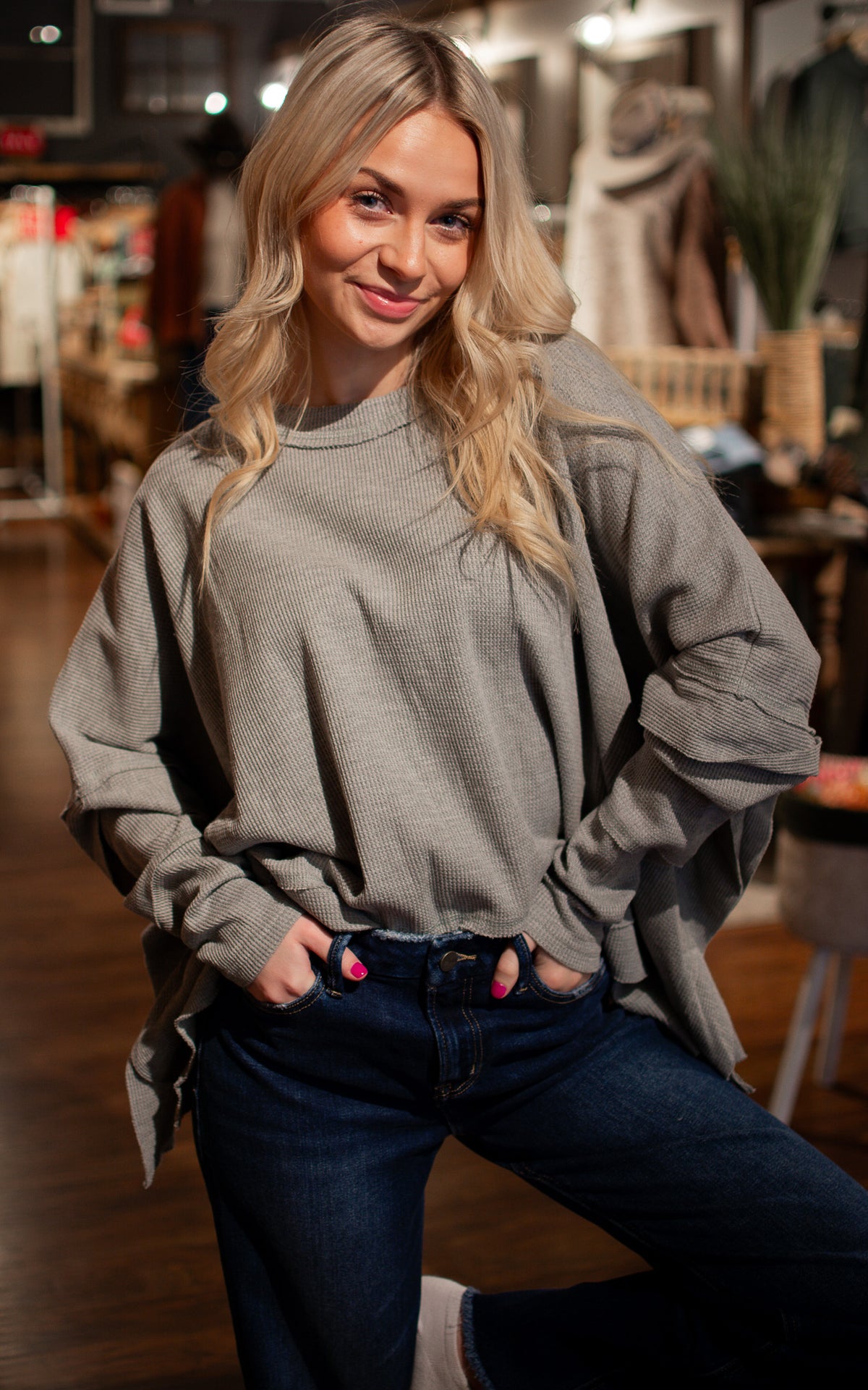Get cozy with the Lounge Day Waffle Crewneck. Made from medium weight waffle material, this top takes the chilly edge off while keeping you stylish. The flattering poncho type fit adds an extra layer of comfort. Perfect for Spring!