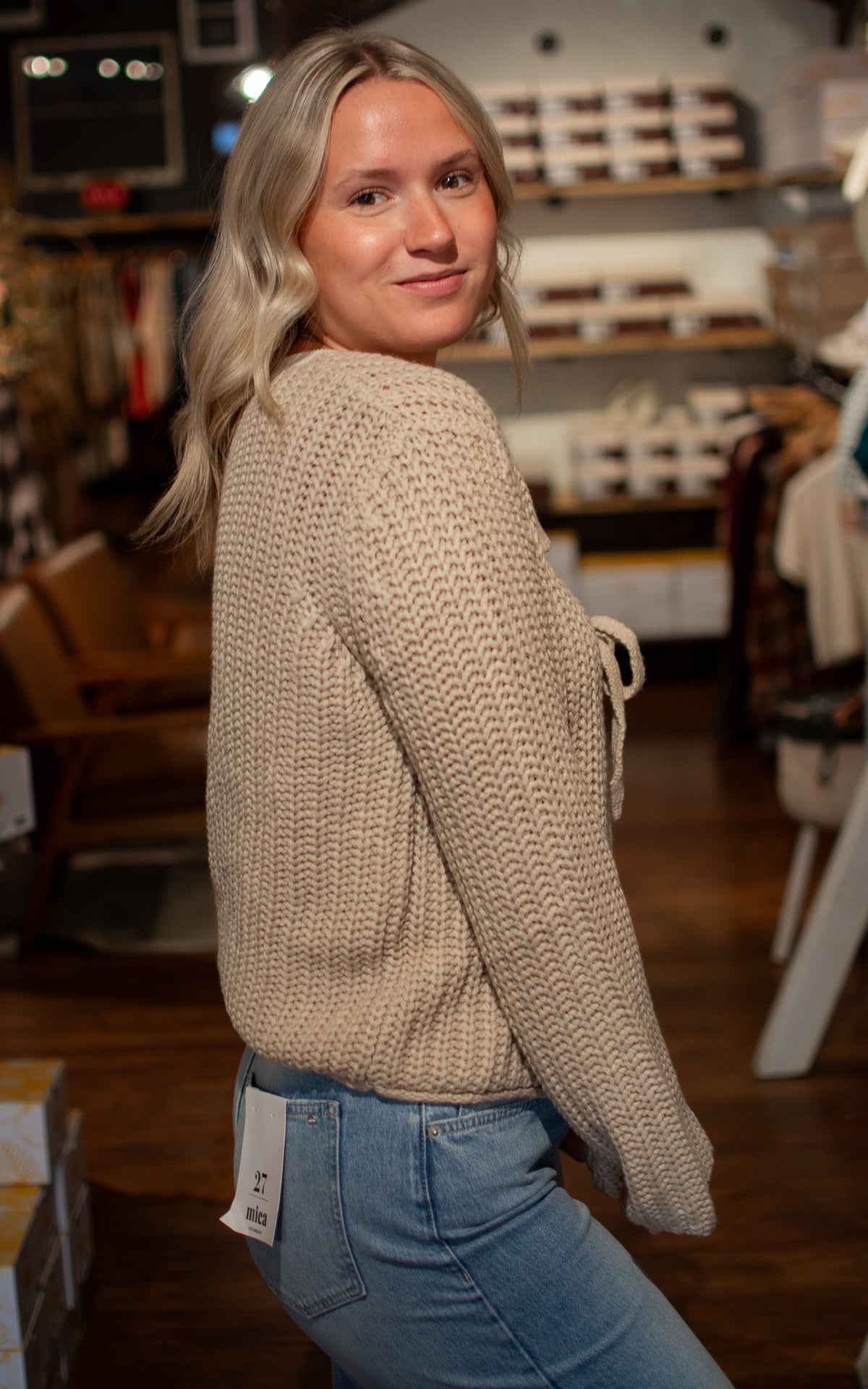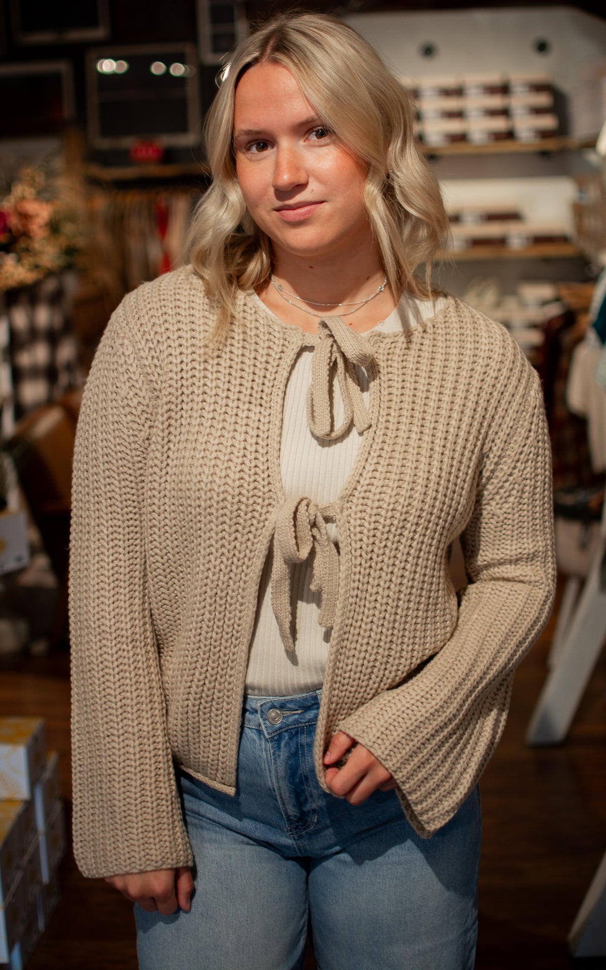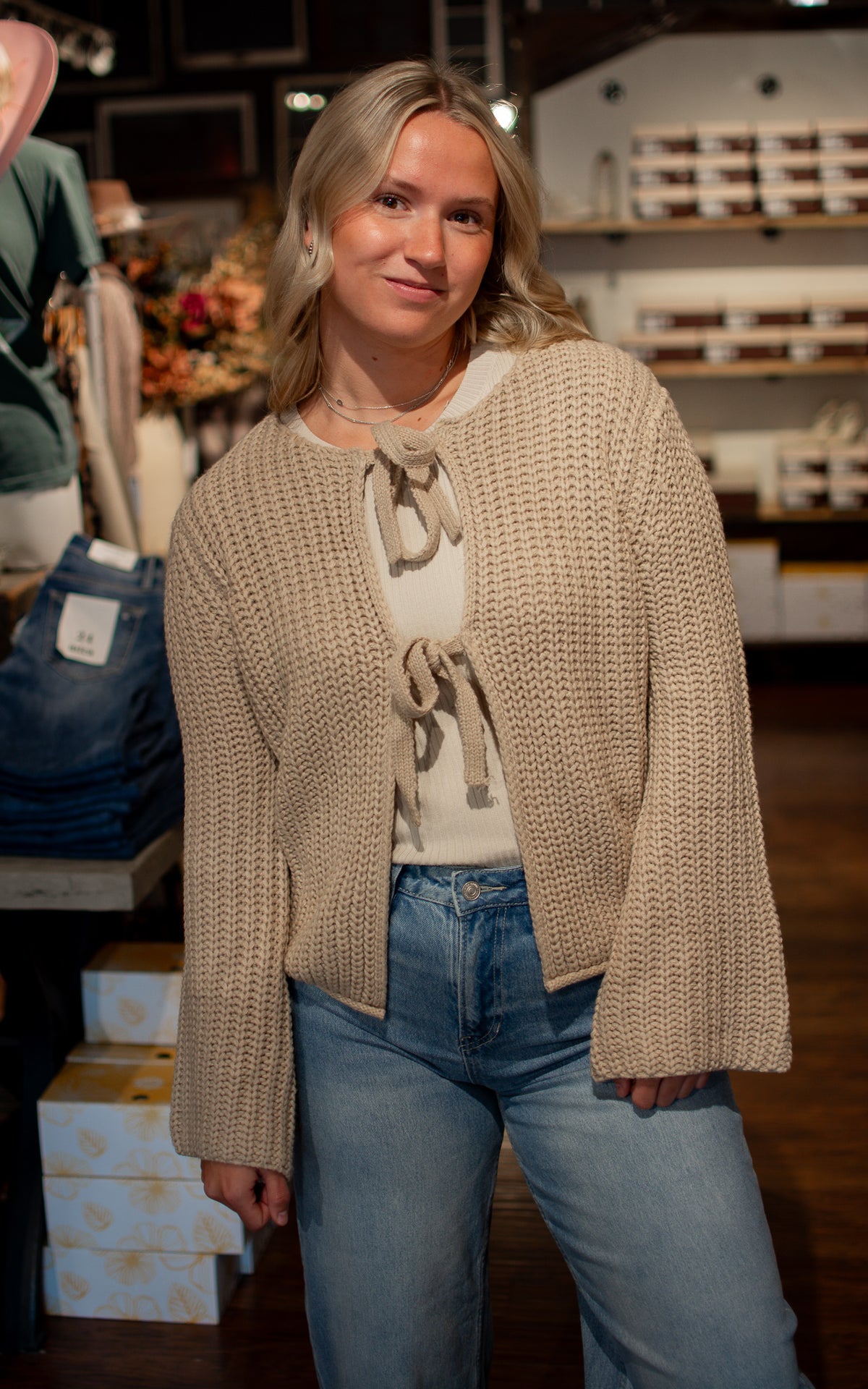 Meet your new go-to layer: the Maeve Loose Knit Cardigan. This chunky oat-colored cardigan with long sleeves and a playful tie closure adds cozy charm and effortless style to any outfit.