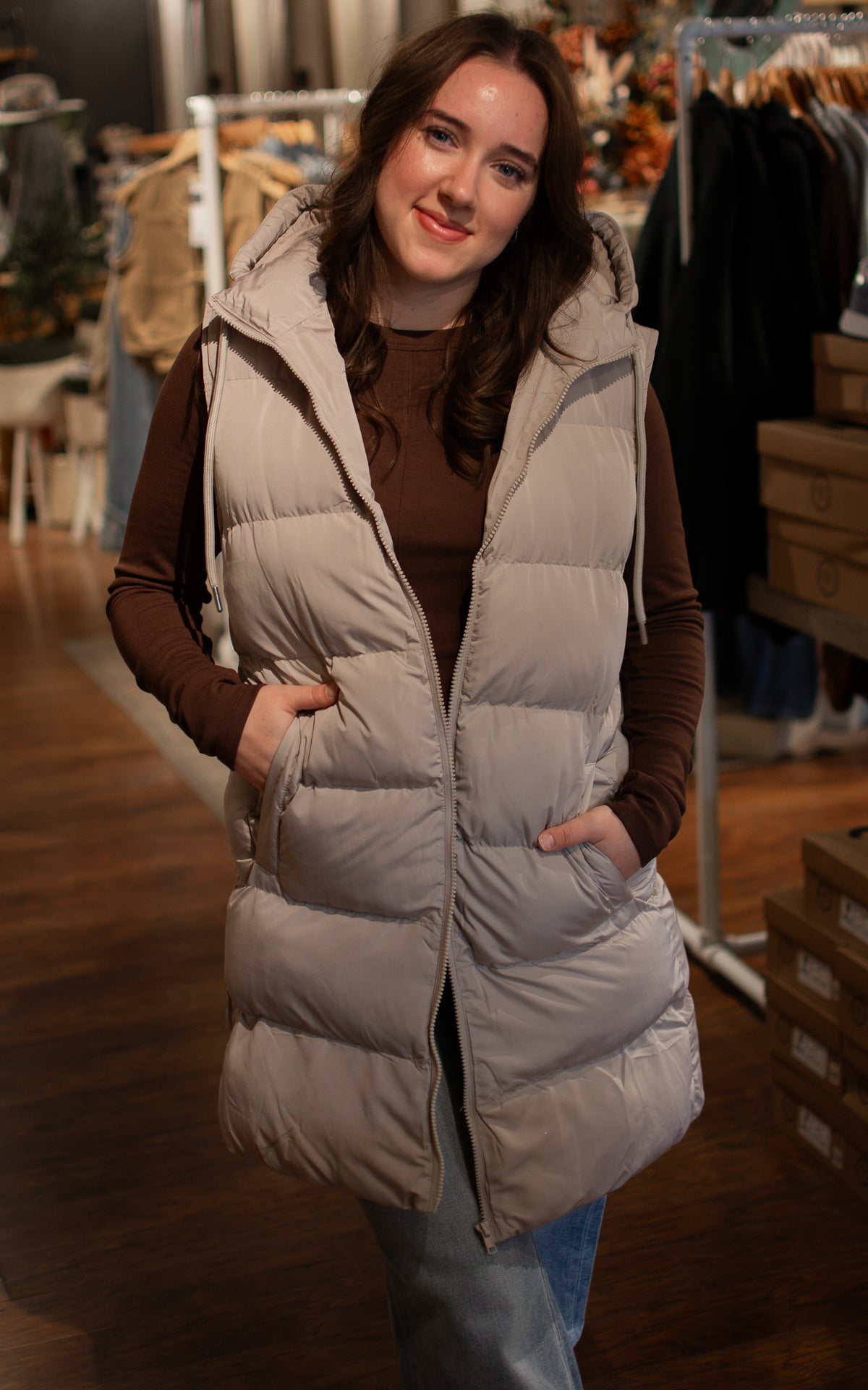 Stay cozy and stylish with the Maple Staple Puffer Vest, the ultimate mom must-have for chilly days. Whether you choose classic black or warm beige, this long puffer vest features a comfy hood to keep you snug during every school run or weekend adventure. Lightweight yet warm, it layers effortlessly over your favorite outfits, making busy days a little easier—and a lot more fashionable.