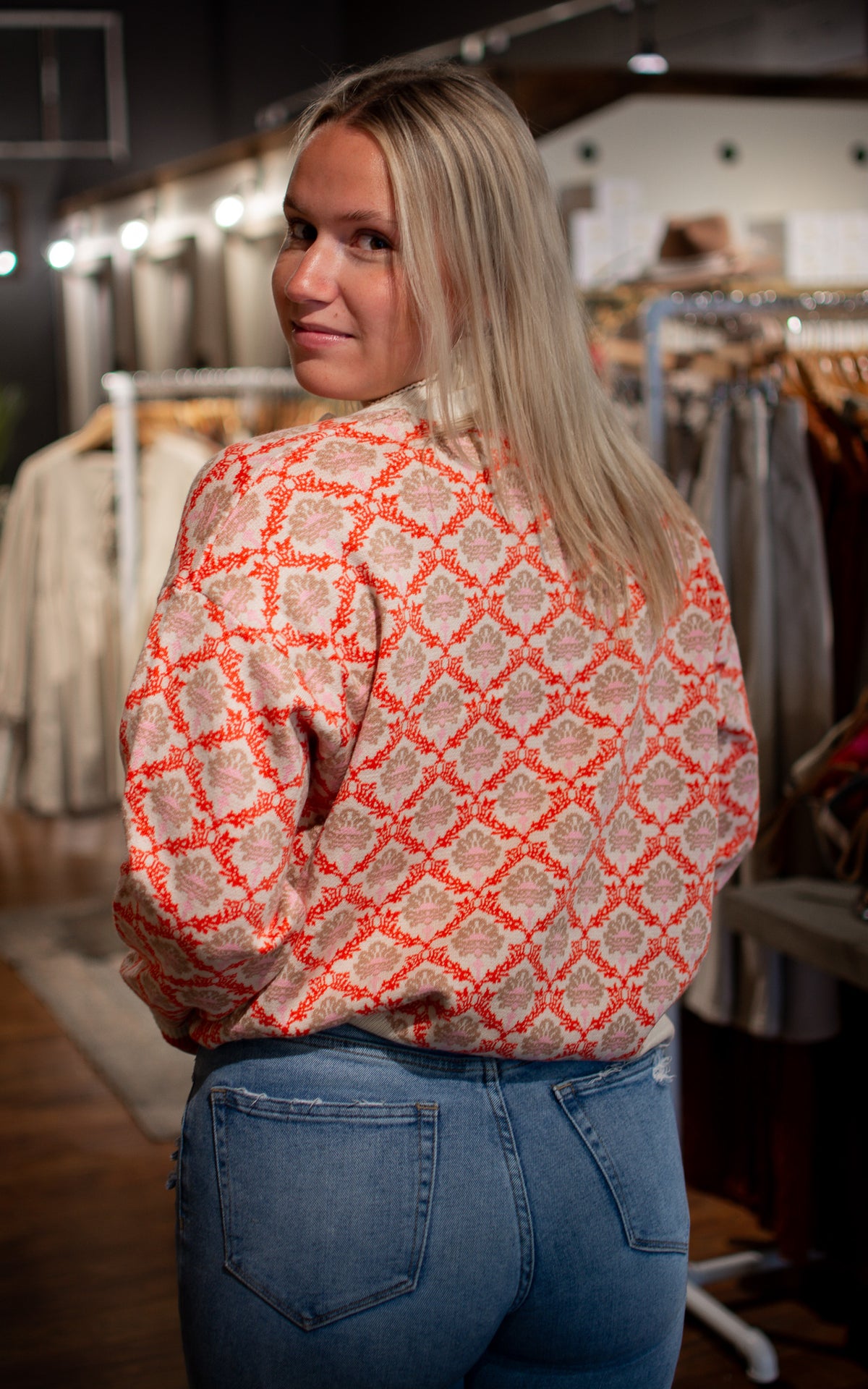 Add a splash of fun to your wardrobe with the Mari Orange Sweater! Featuring a lively tan and bright orange pattern, this 1/4 zip is perfect for playful layering and easy style. Whether you’re out and about or cozying up, it brings a cheerful pop of color to any look.