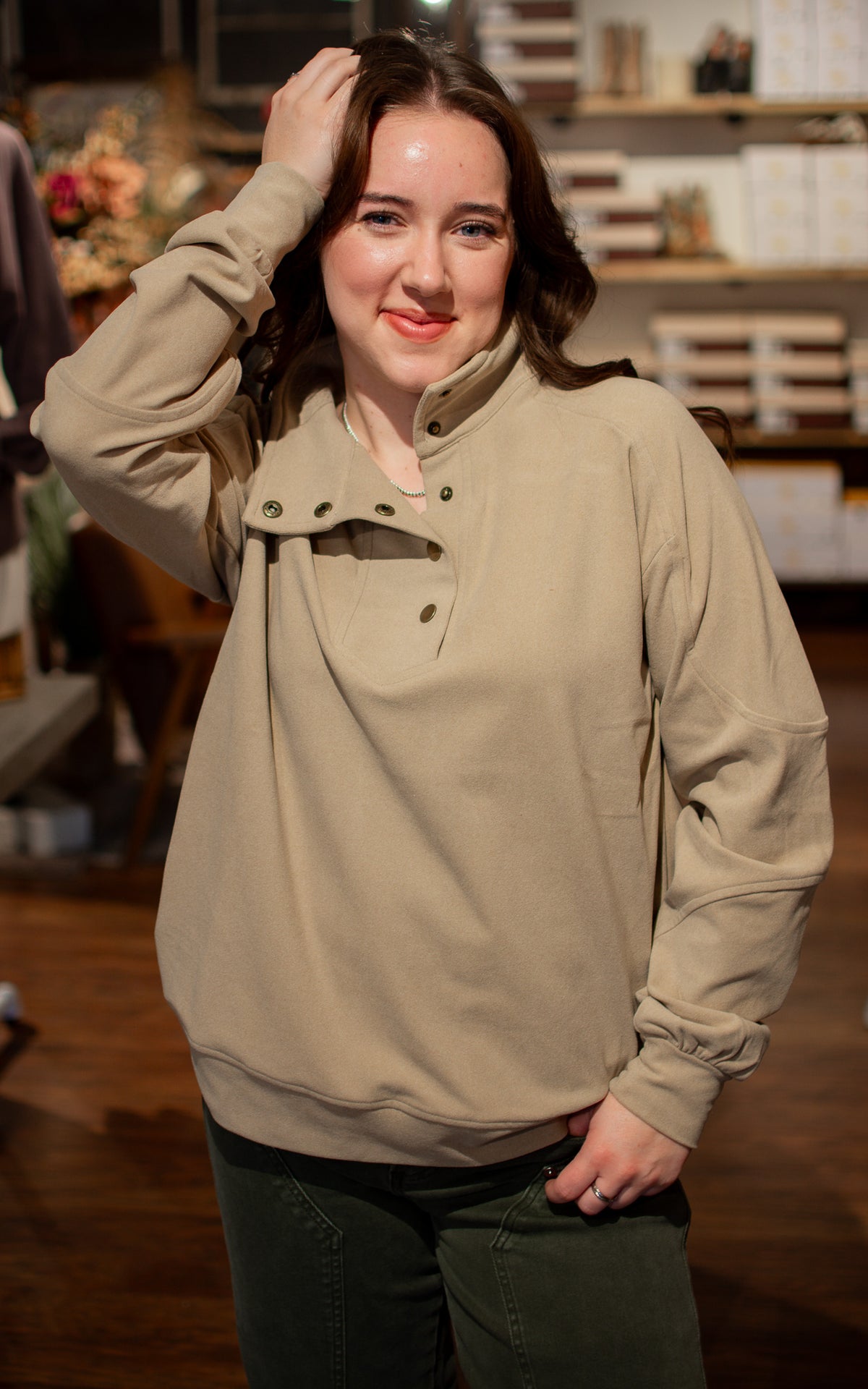 The Mushroom Hunting Sweatshirt in mauve or tan features a fun 1/4 snap button up front and is crafted from irresistibly soft, buttery fabric. Its playful design makes it perfect for cozy days outdoors or casual hangouts, adding a touch of whimsy to your comfy wardrobe.