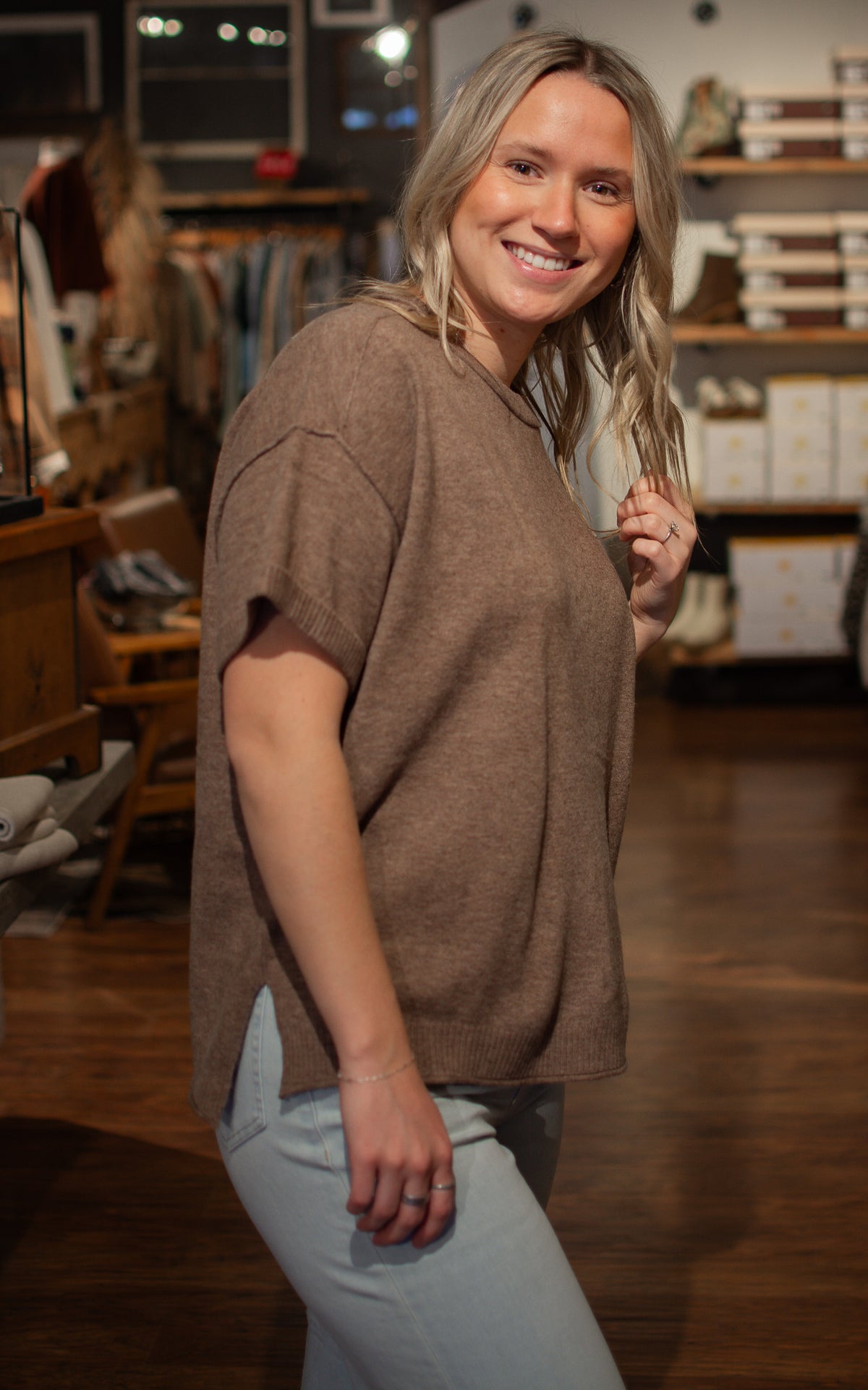 Office Gal Sweater Tee Cozy meets cool in this brown sweater tee that's anything but boring. The flowy silhouette skims your frame without clinging, giving you that effortlessly put-together vibe whether you're at your desk or out on the town. A reliable basic that feels like a warm hug and looks way more interesting than your average tee.