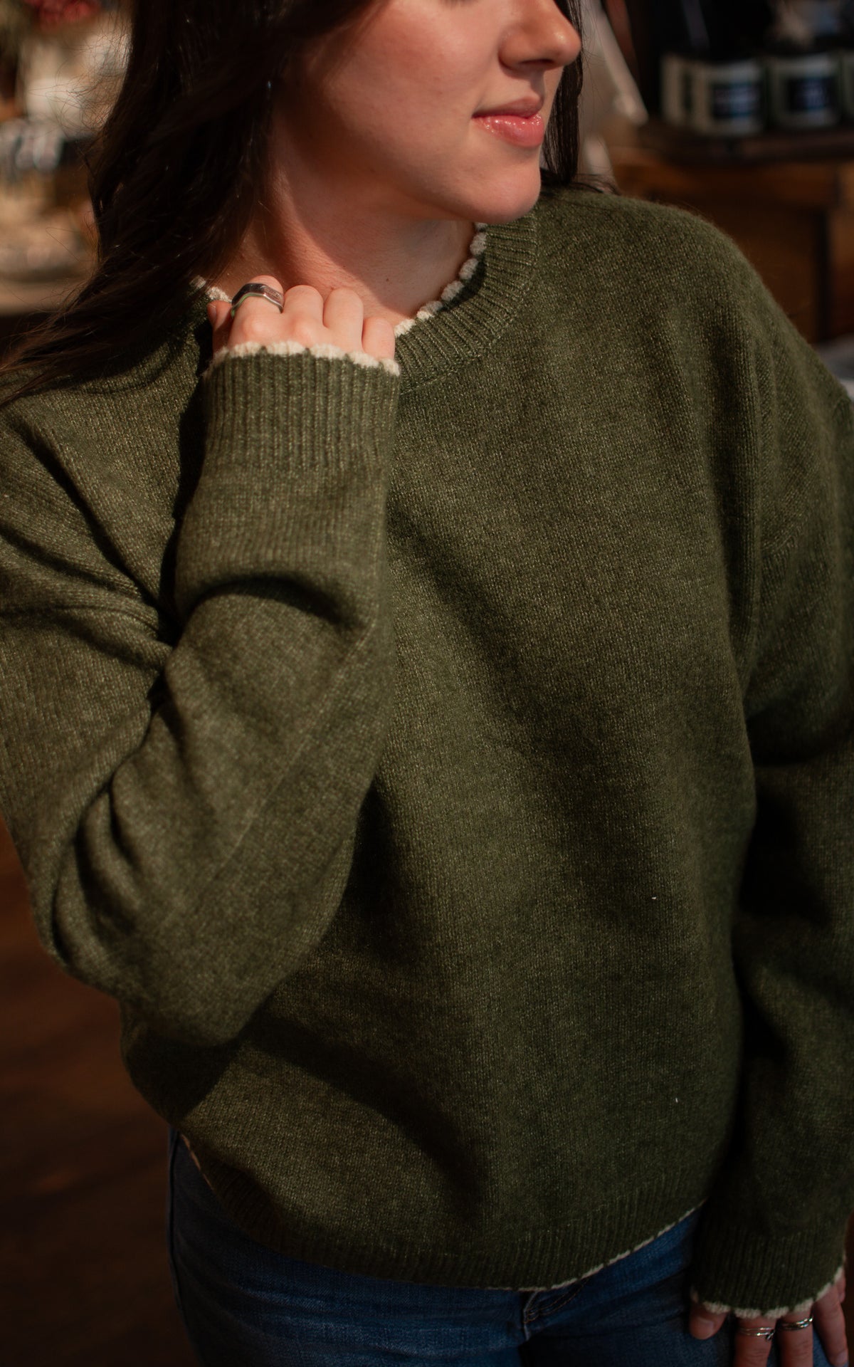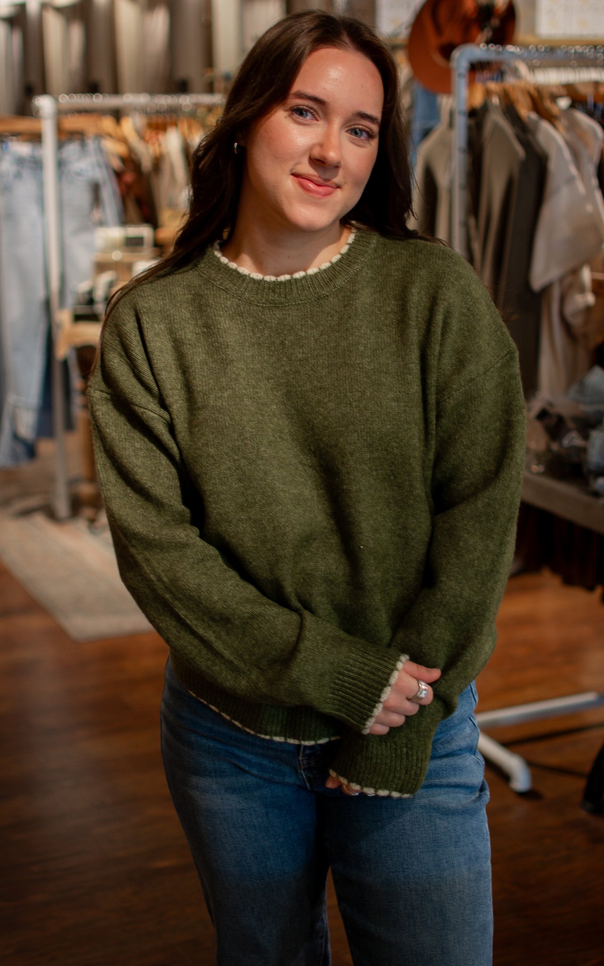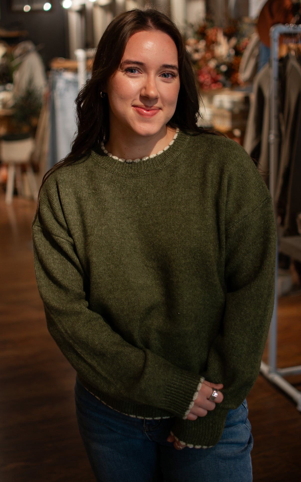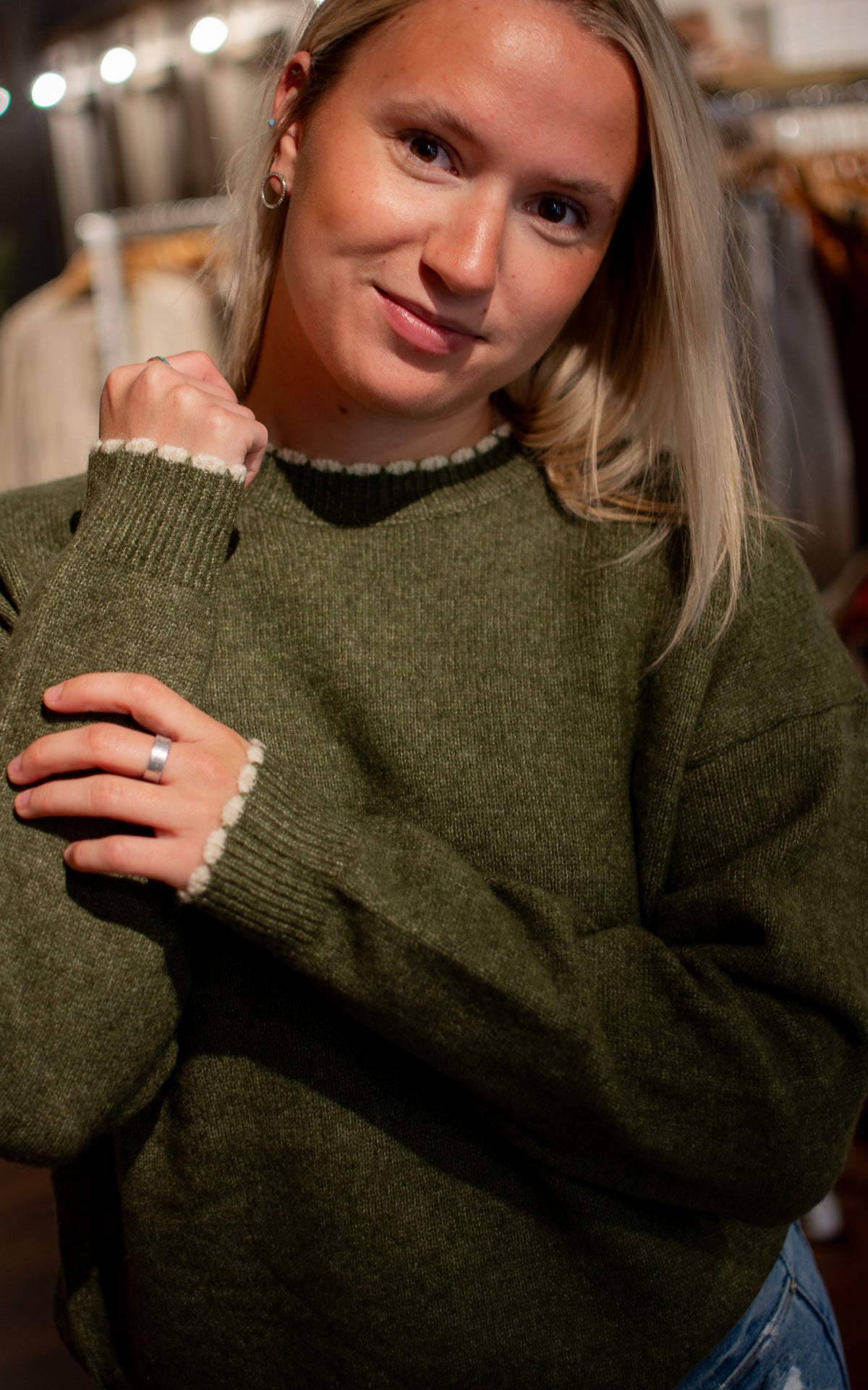 Add a playful pop to your fall wardrobe with the Olive You Sweater! This olive green beauty features crisp white scallops at the neckline, hem, and cuffs, bringing a charming twist to a cozy classic. Perfect for layering or wearing solo, it’s the fresh color your autumn outfits have been waiting for.
