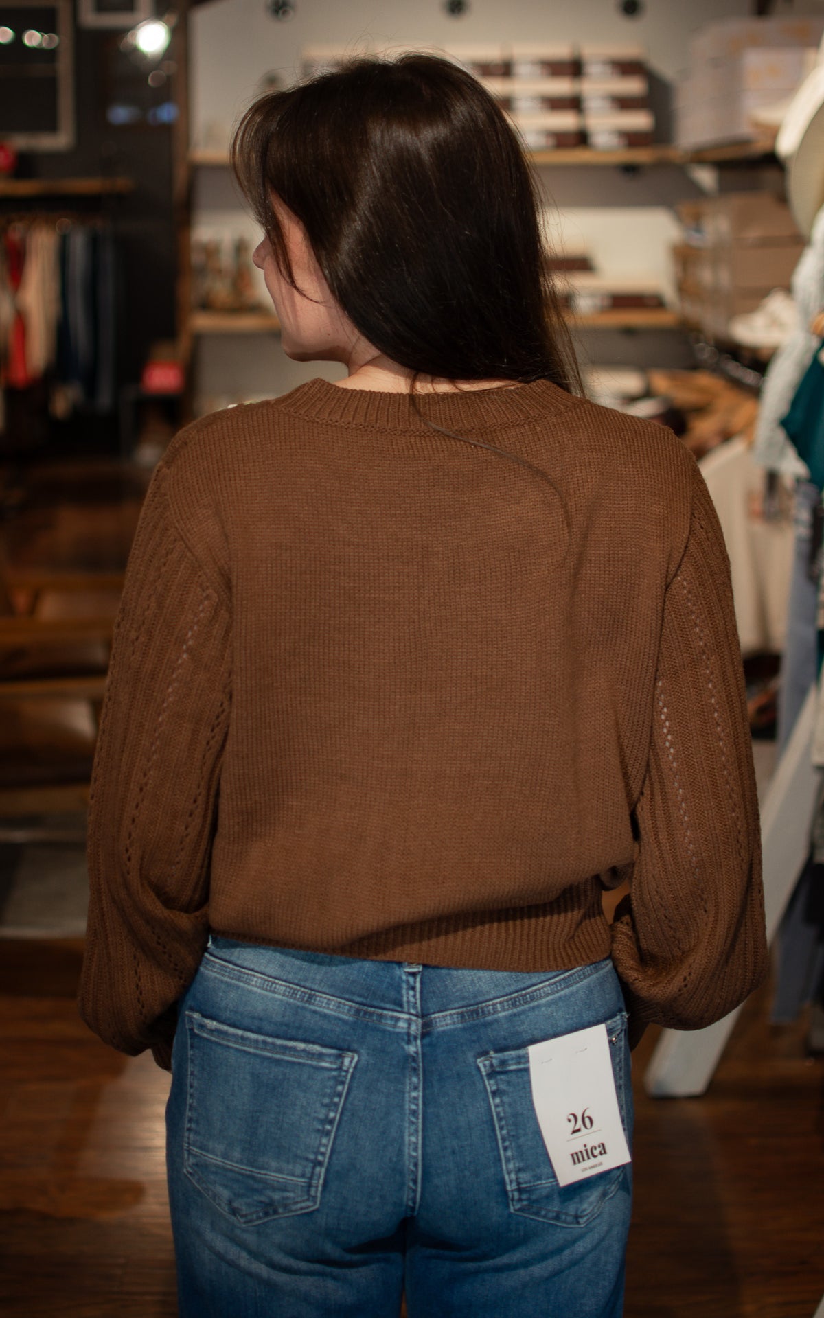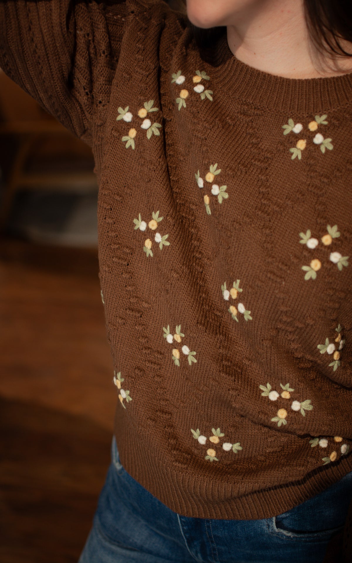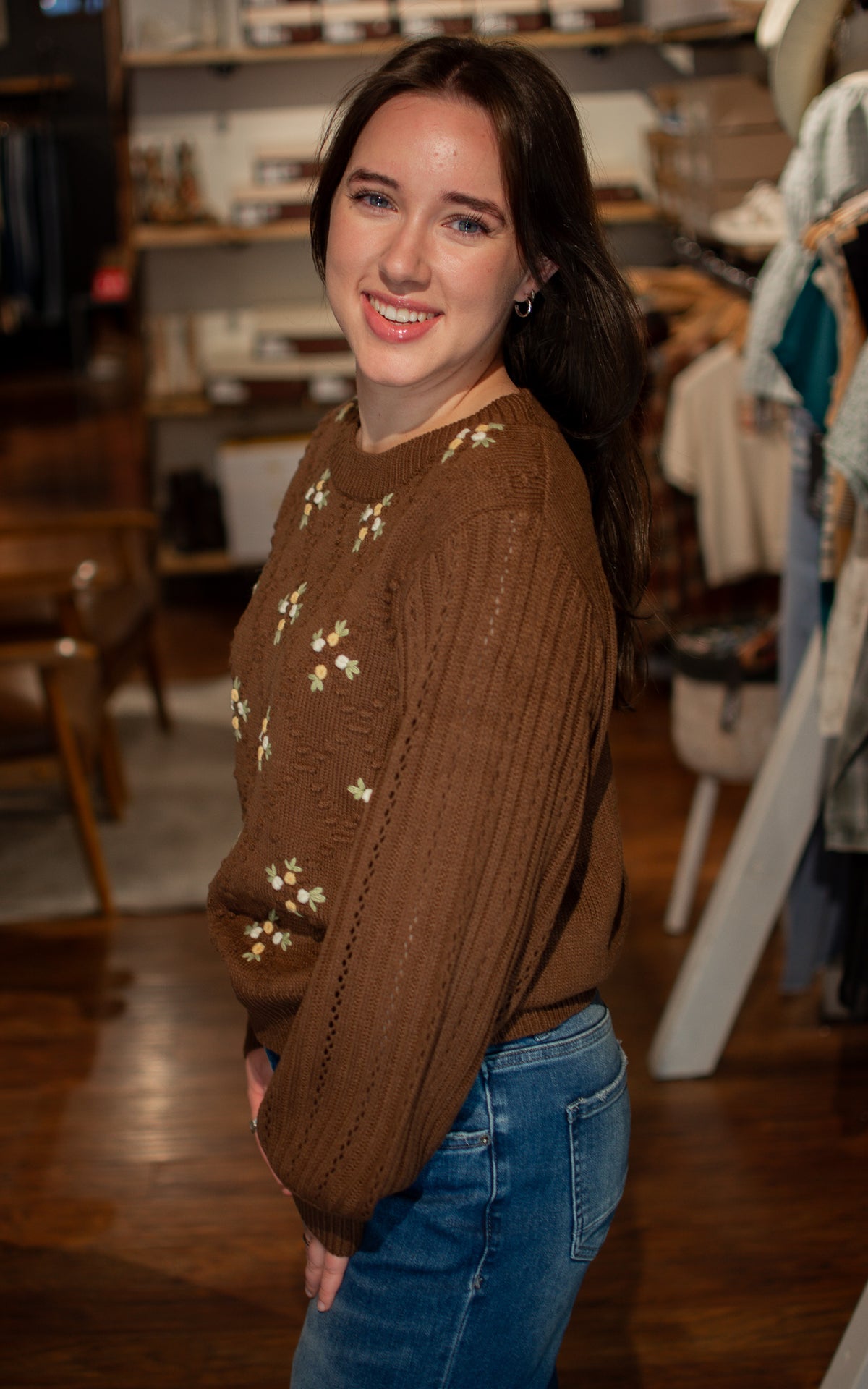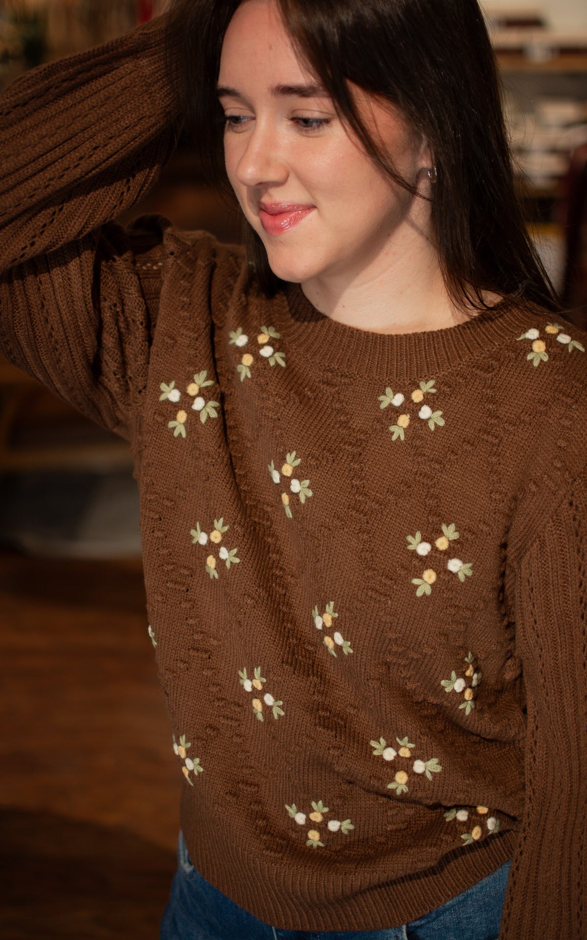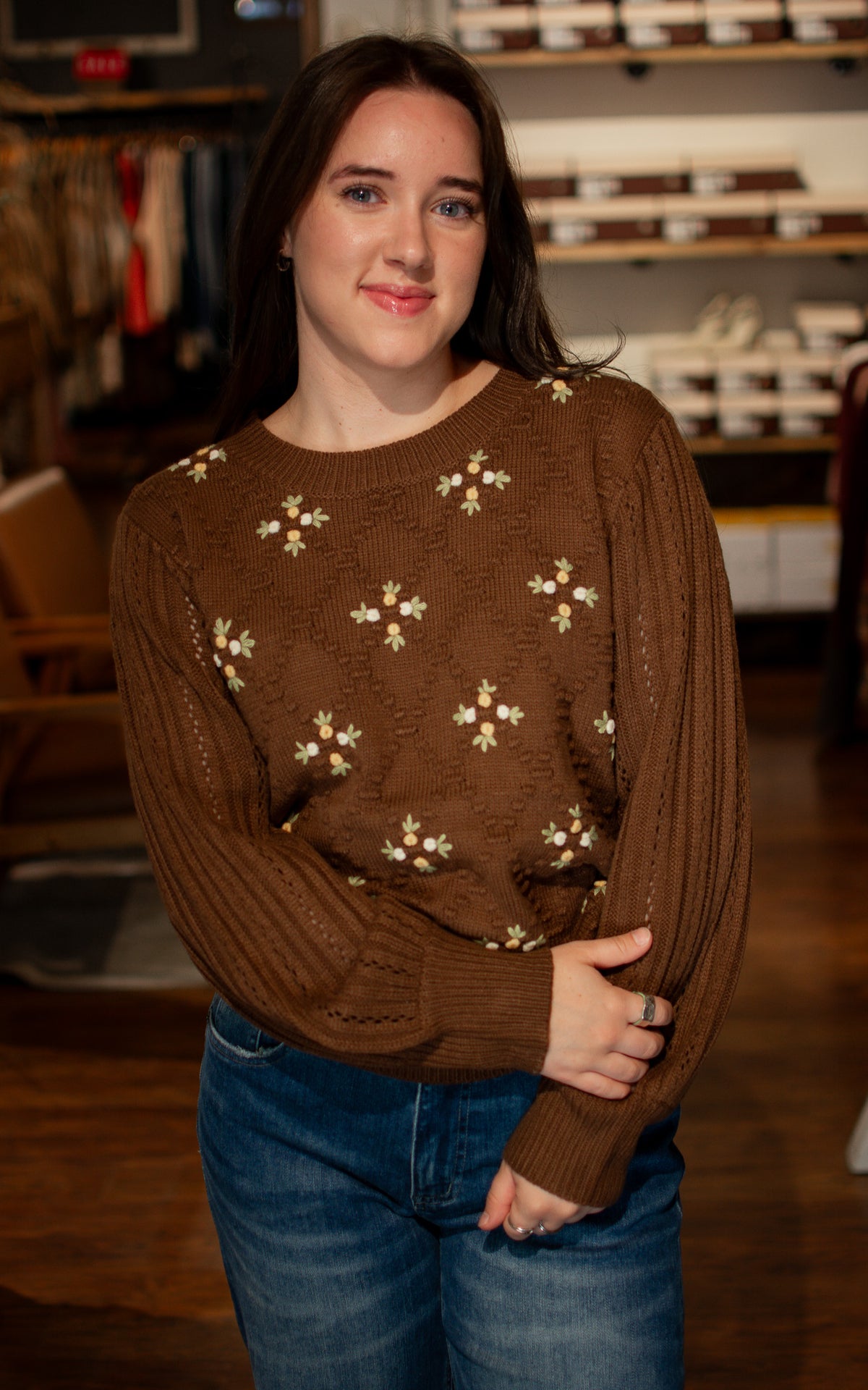 Bring a playful touch to your cozy days with Patty's Puff Sleeve Sweater. This chocolate brown beauty features charming flower embroidery and fun puff sleeves, perfect for adding a whimsical twist to your everyday style.