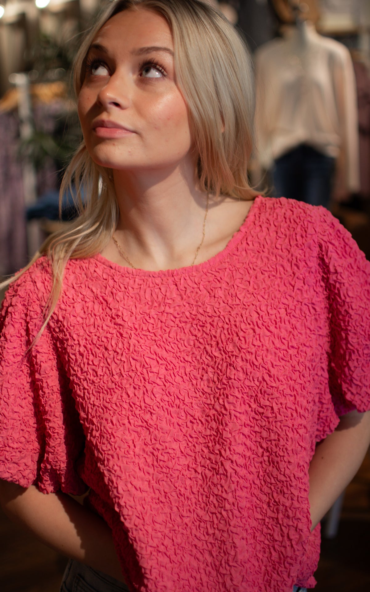 Get ready for some fun in the sun with our Pink Ladies Puff Sleeve Top! Made with thick crinkle stretch material, it's not only stylish but also ultra comfortable. The bubble sleeves add a playful touch, making this top a stunning pop of color in your closet. Perfect for those easy days on the porch with some margaritas!