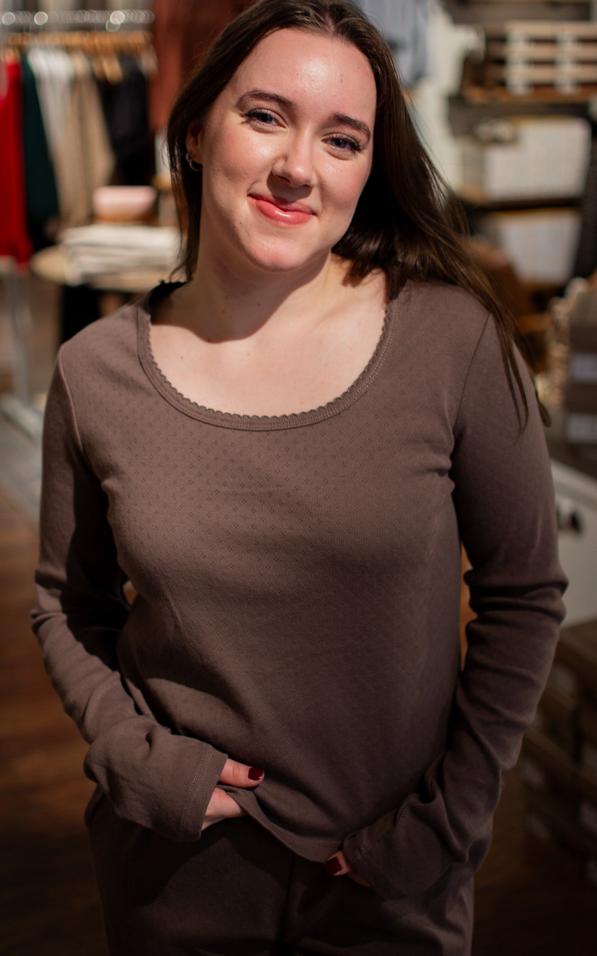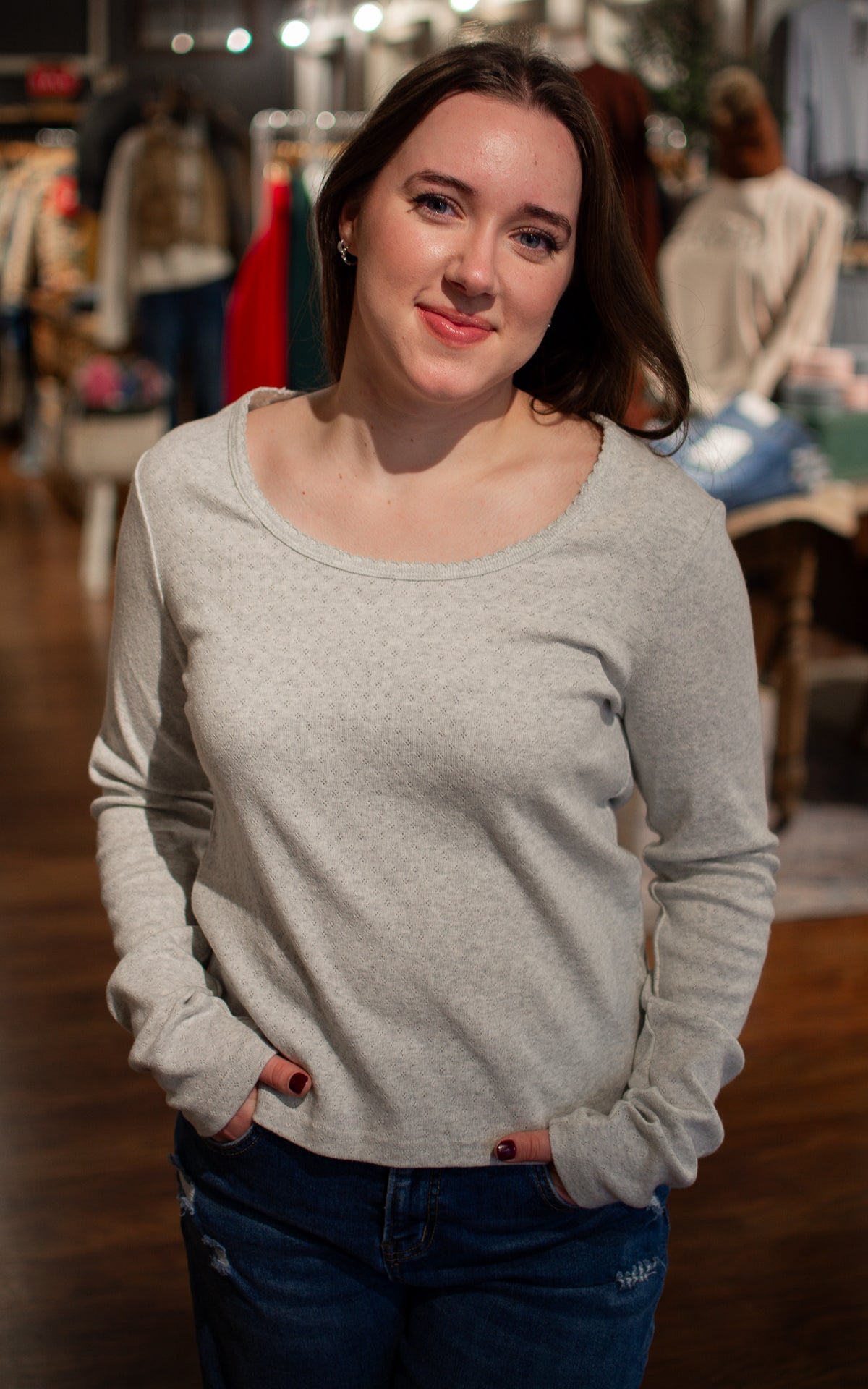 Stay comfortable and stylish with this breathable long sleeve top available in soft light blue, warm brown, or cool light grey. The classic scoop neck offers a flattering, feminine touch while the 100% cotton fabric keeps you feeling fresh and comfortable all day long. Perfect for layering or wearing solo, this versatile piece brings effortless elegance and playful simplicity to your everyday wardrobe—a timeless essential that works with everything.