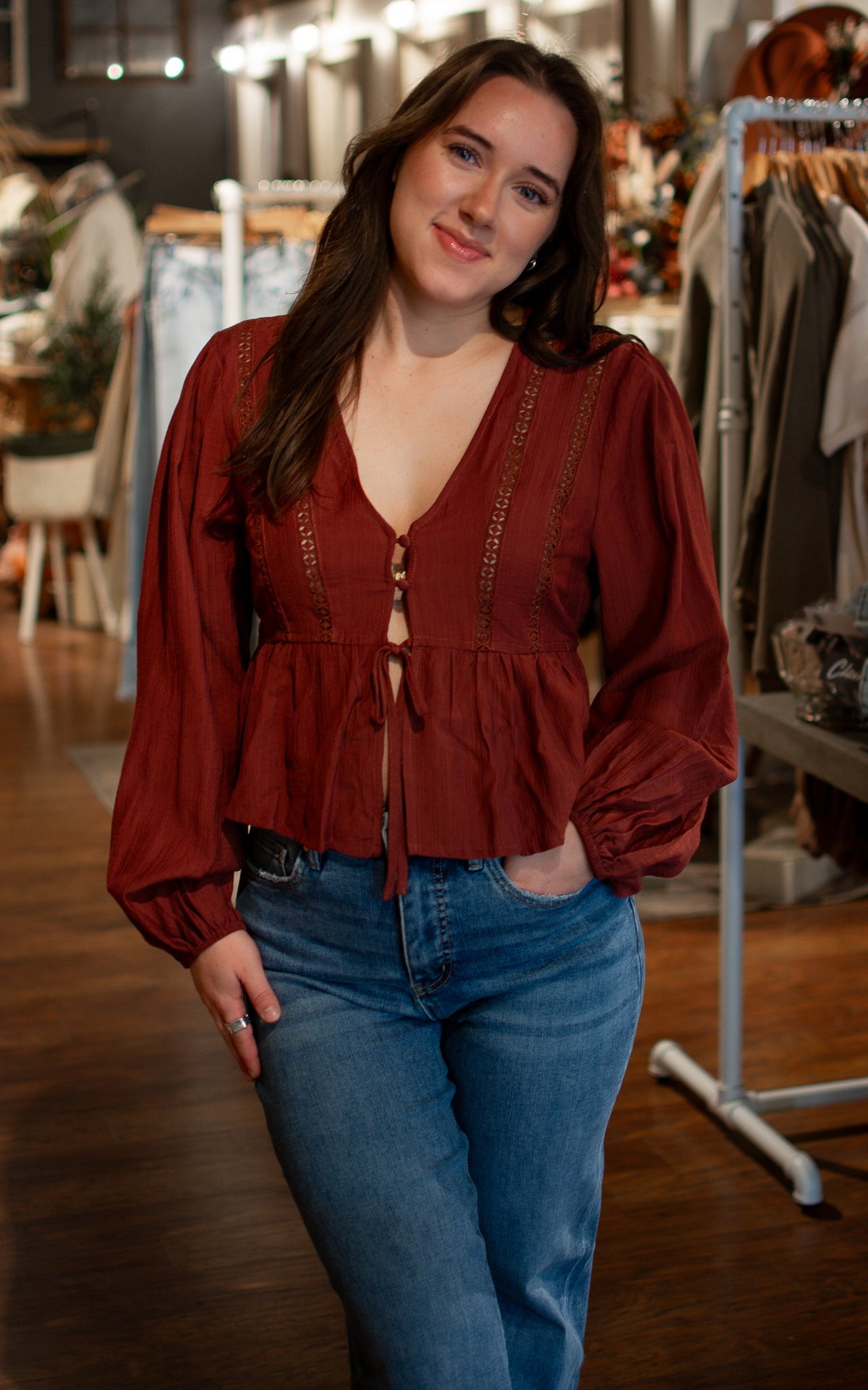 Turn heads in the Rusty Relica Blouse! This playful rust red top features a charming tie detail and a flattering V-neck that adds a touch of flirty fun. With a classic button closure, it’s perfect for mixing casual comfort with stylish flair wherever you go.