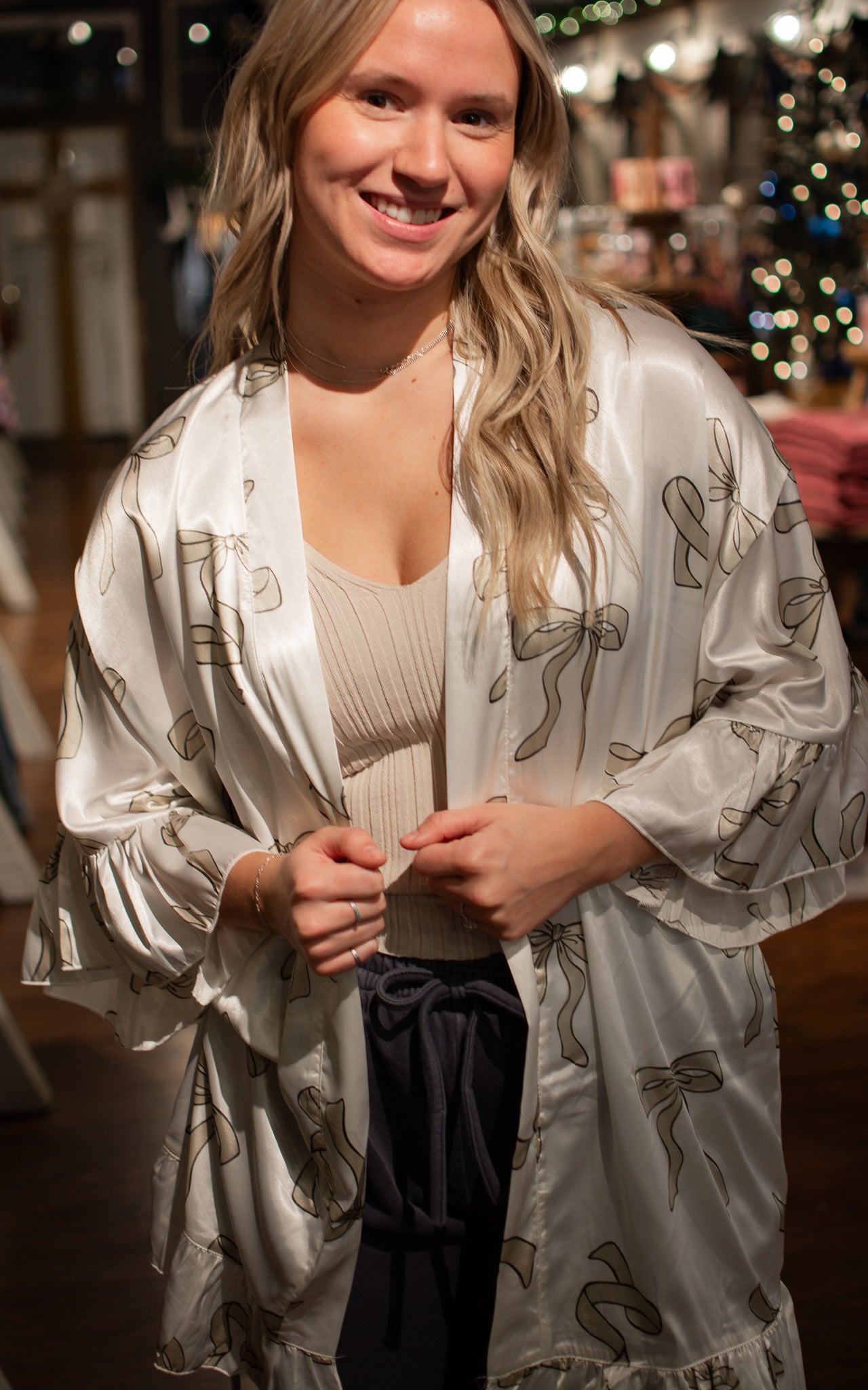 Tie up your loungewear game with this adorable white satin robe adorned with charming bows. The luxe satin fabric drapes beautifully while the playful bow details add a touch of sweetness to your everyday comfort. Whether you're sipping morning coffee or getting ready for bed, this robe makes you feel like you're treating yourself. Soft, elegant, and utterly delightful.
