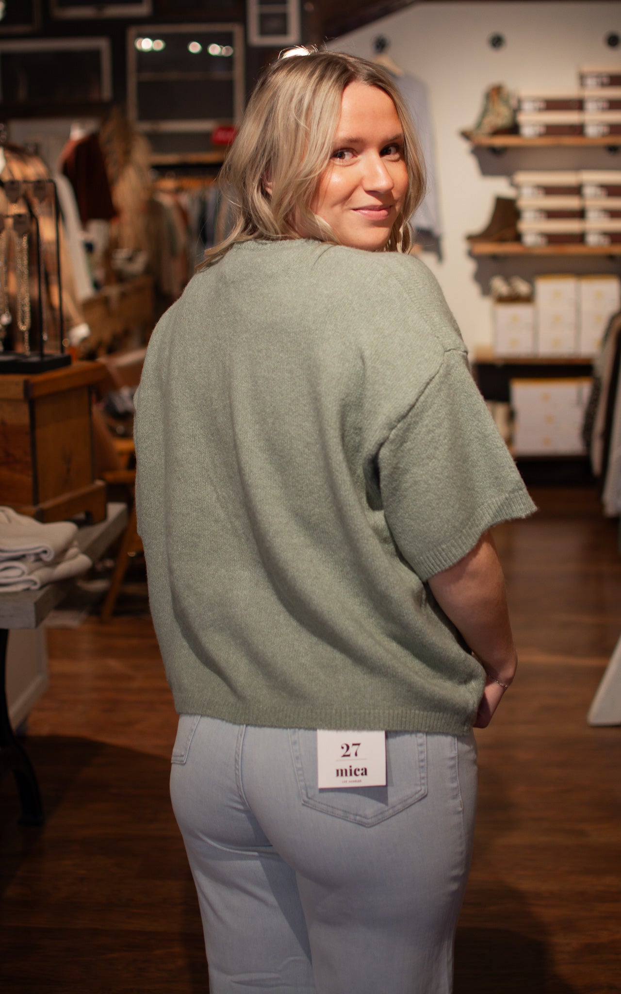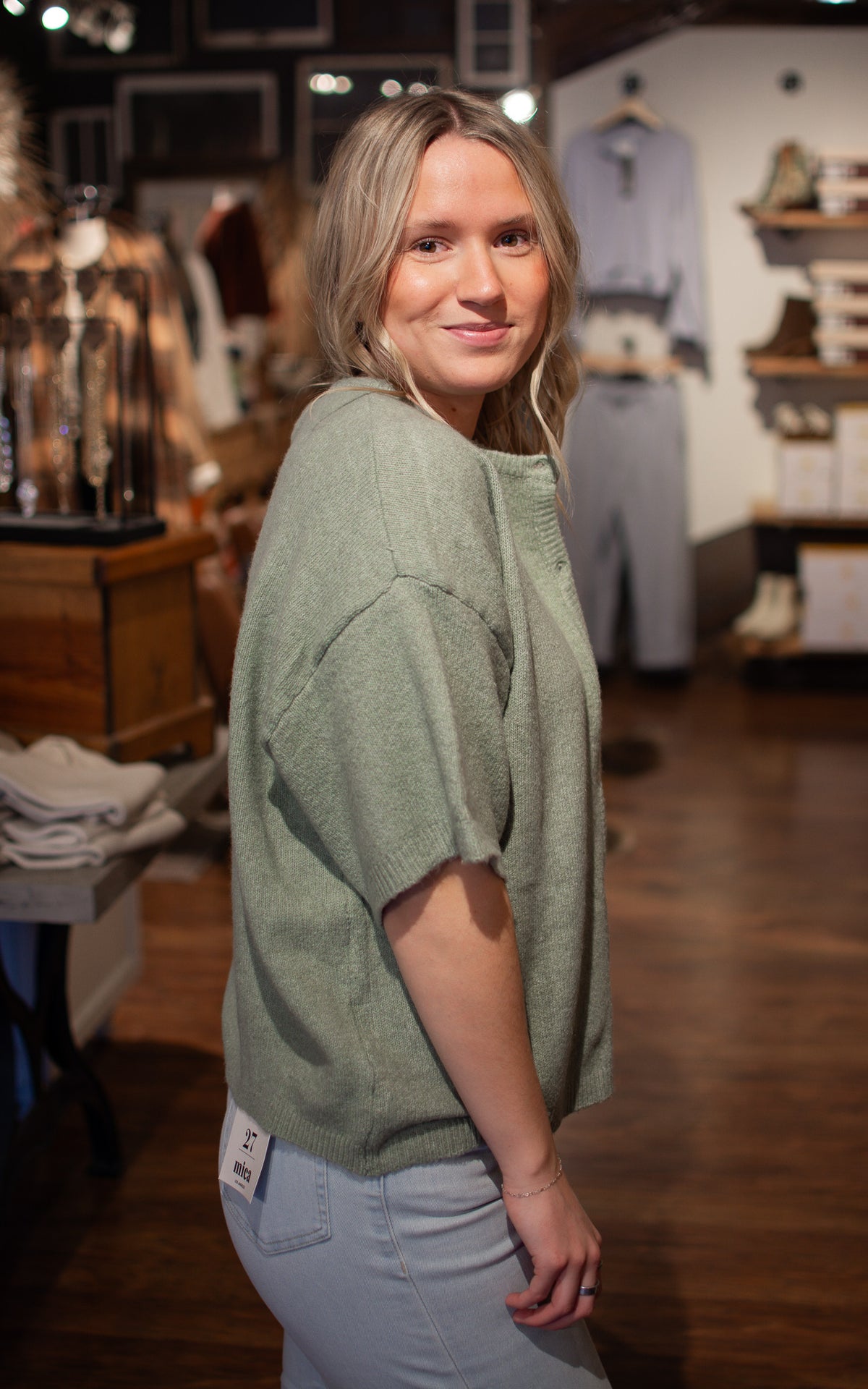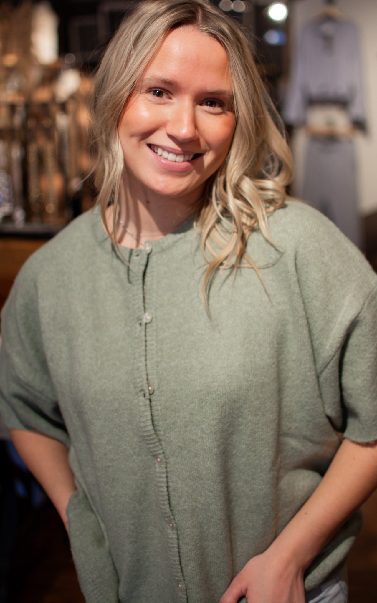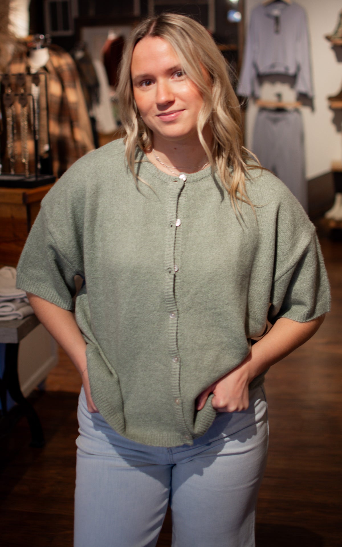 Seeded Sage Cardigan Calm, cool, and collected—this sage short sleeve cardigan is your new favorite layer. Classic button closures make it easy to adjust your coverage throughout the day, while the soft, muted tone pairs beautifully with everything in your closet. Throw it on over a dress, a tee, or nothing at all for effortless, polished style.