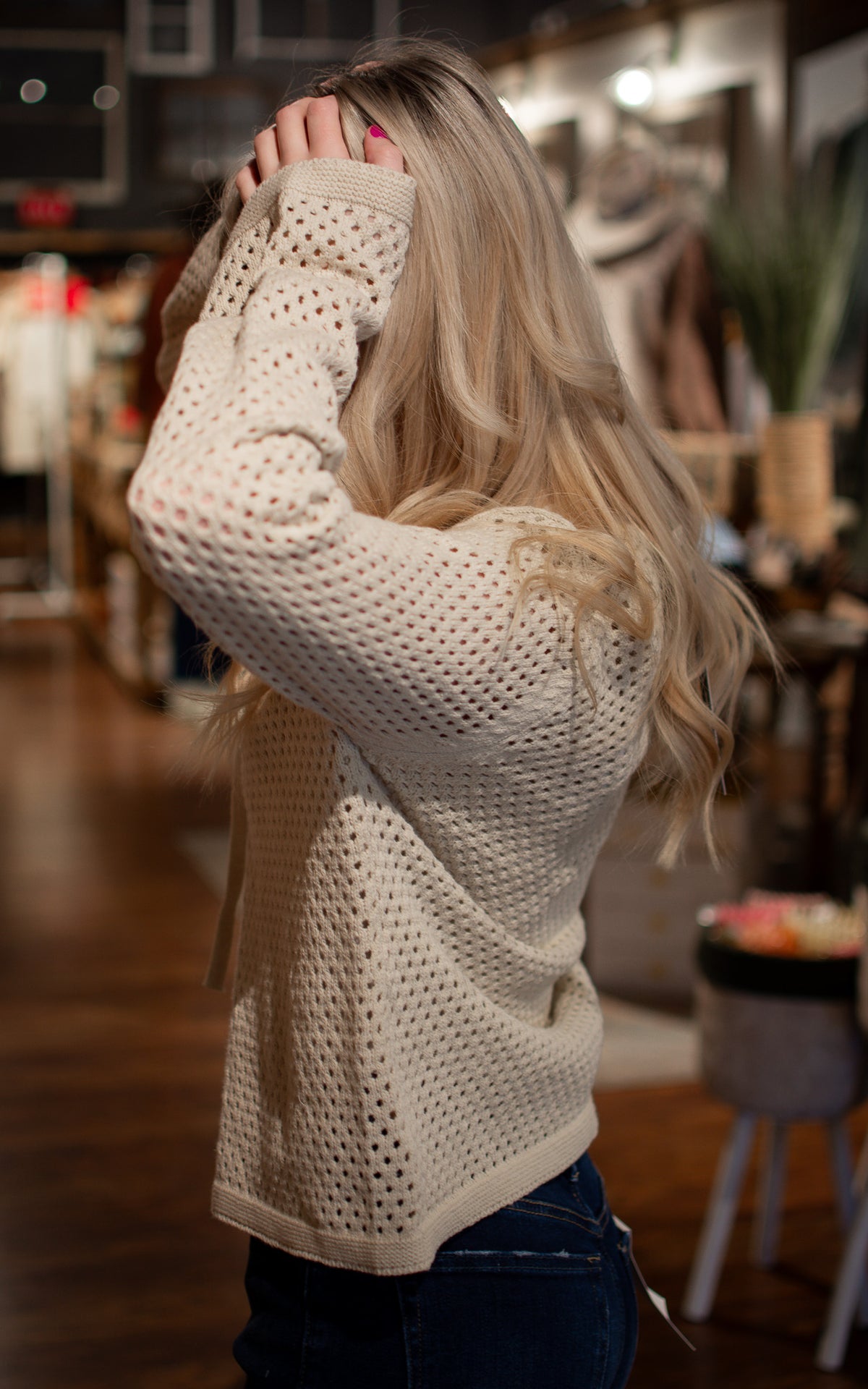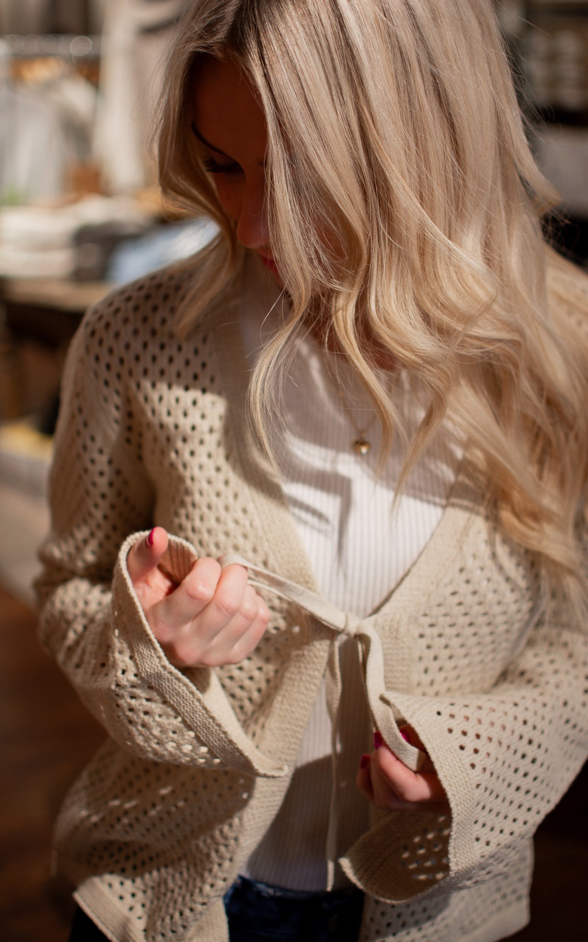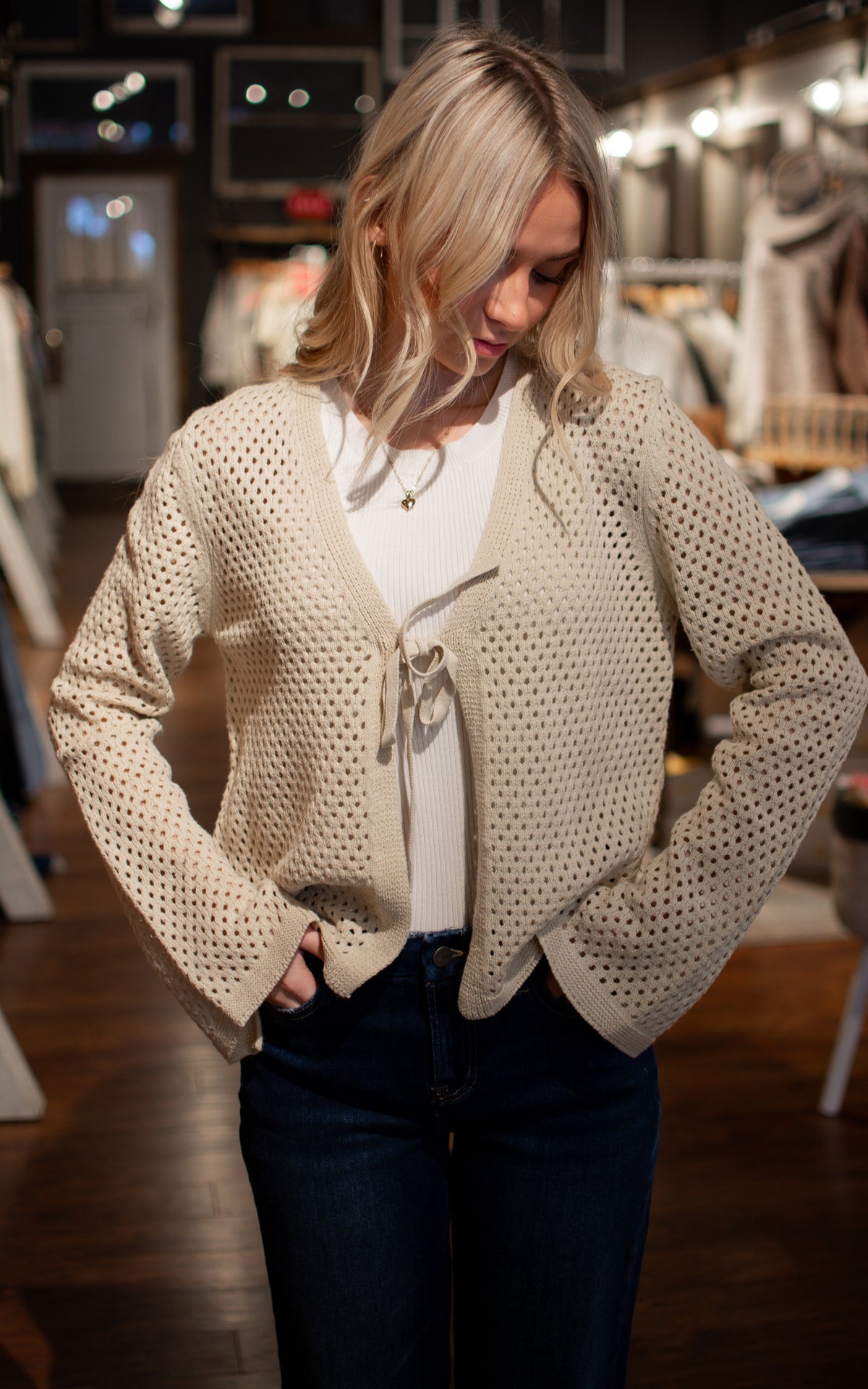 Get ready to tie the knot with this Spring Tie Cardigan! With a sweet open knit design, wide sleeves, and a chest tie, you'll be the ultimate Cardigan girl. Perfect for a playful and quirky look, this cardigan adds a touch of fun to any outfit. It's a must-have for your wardrobe!