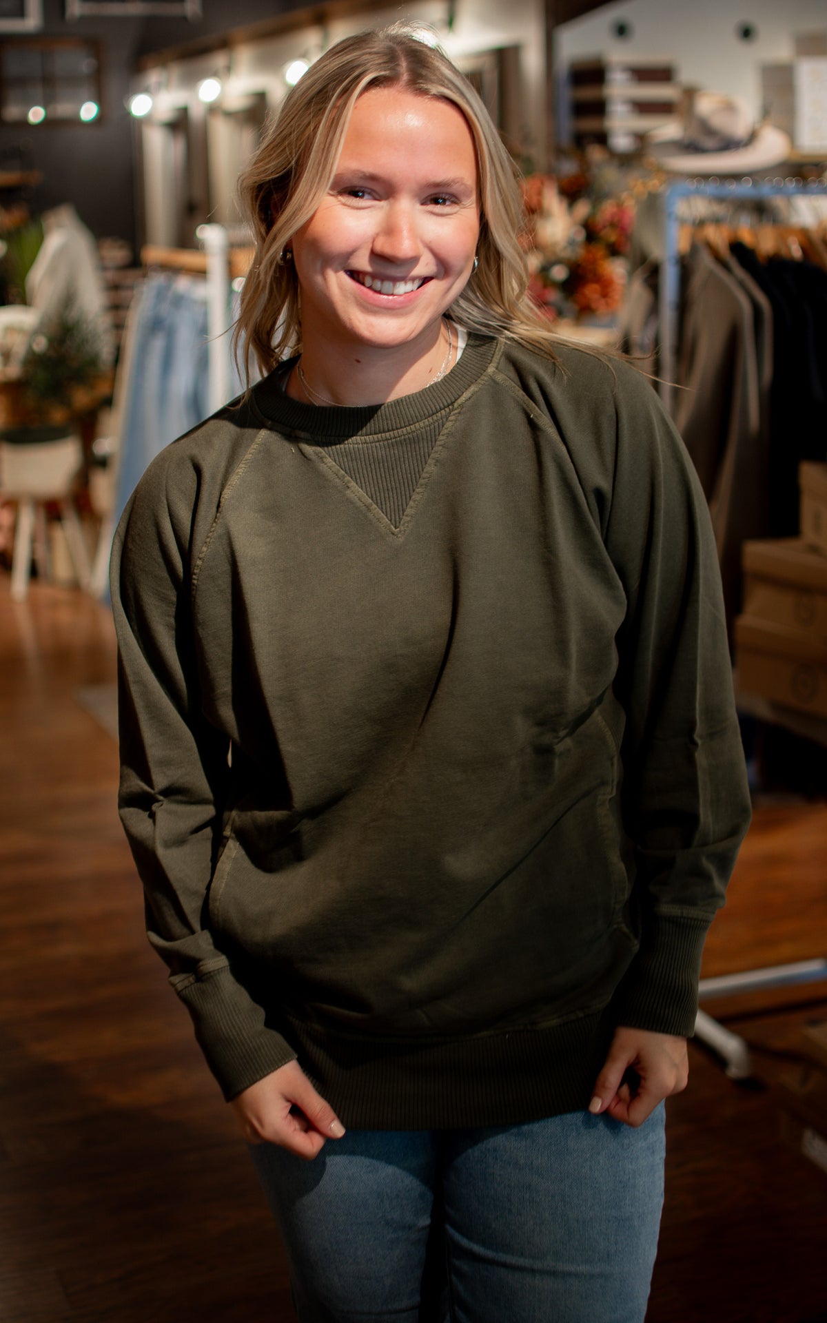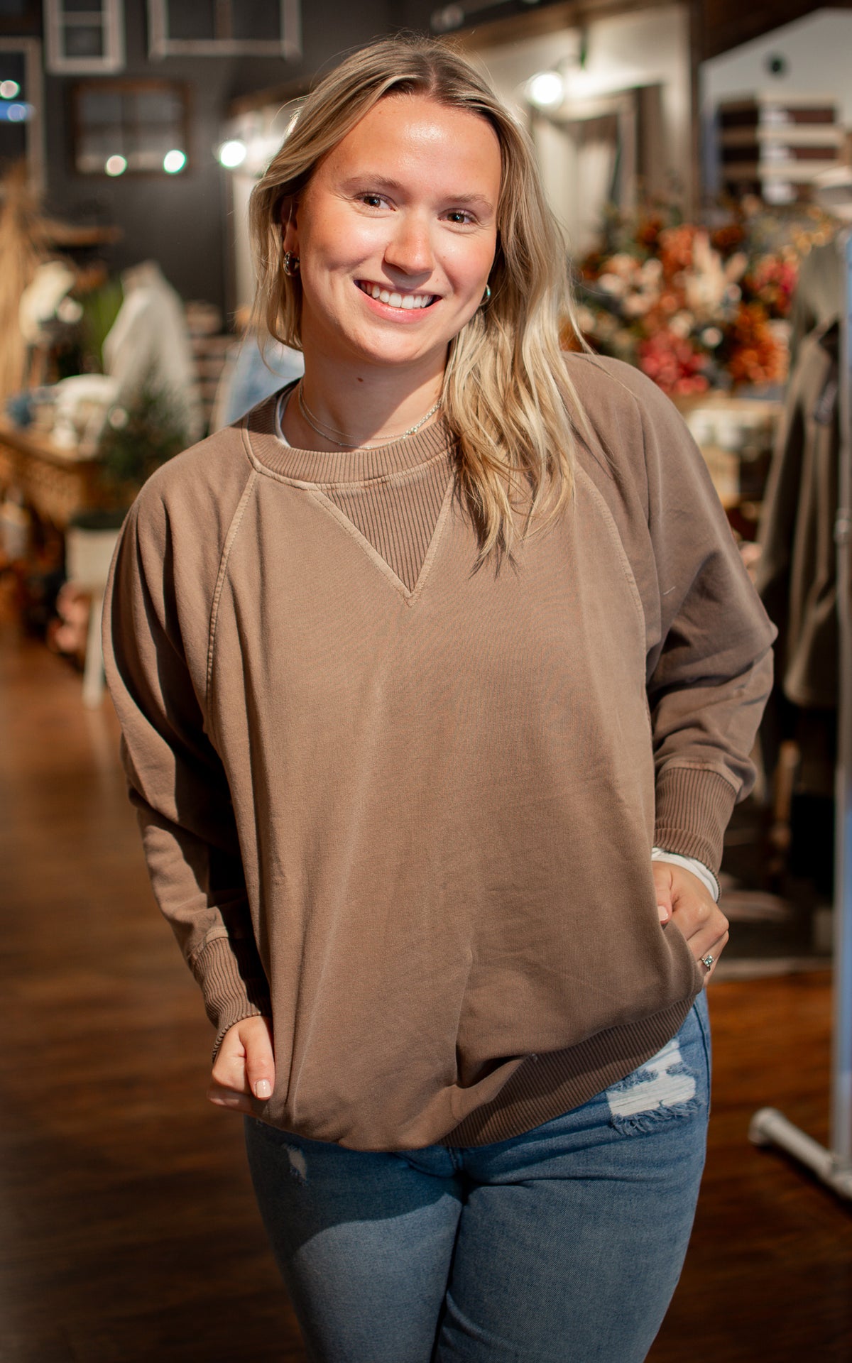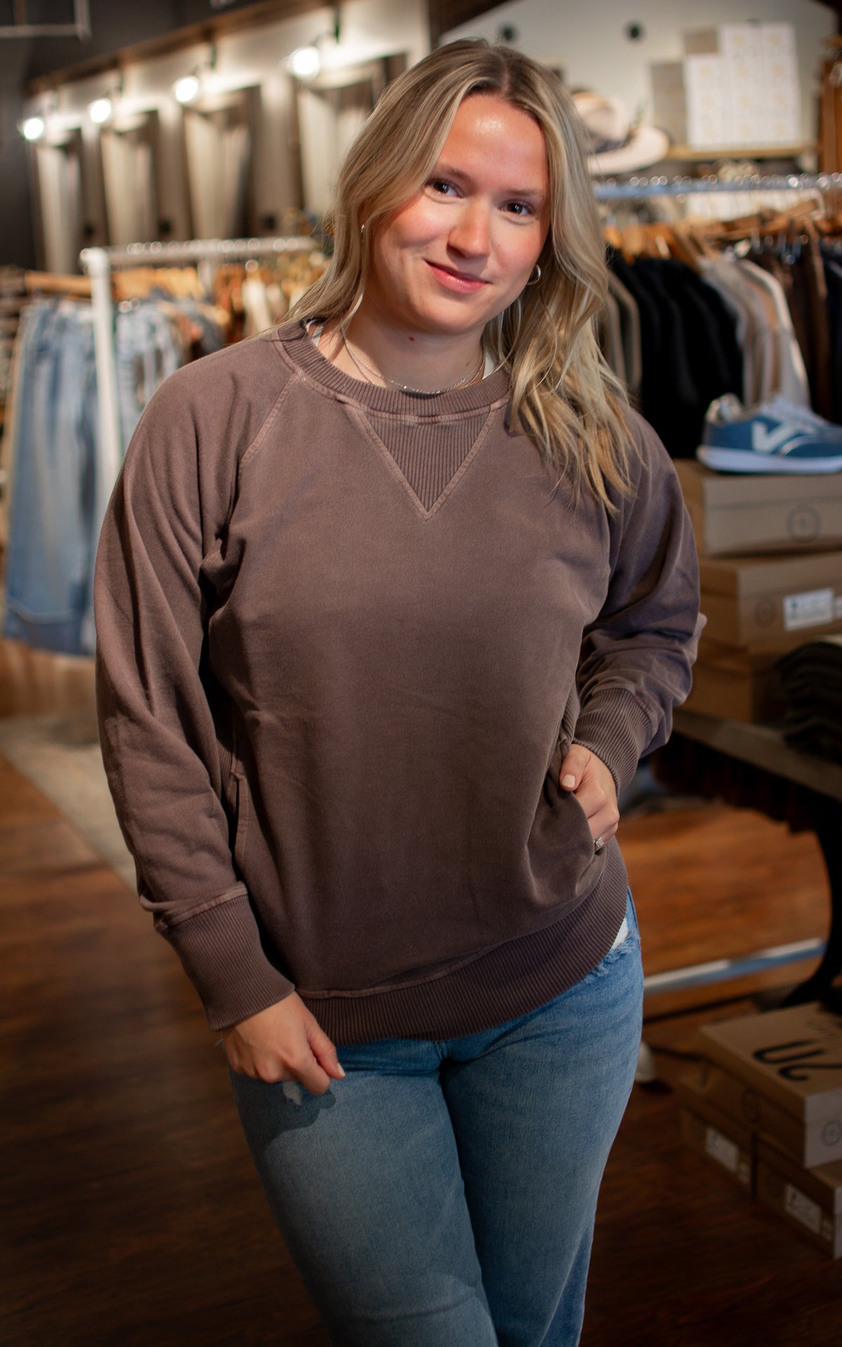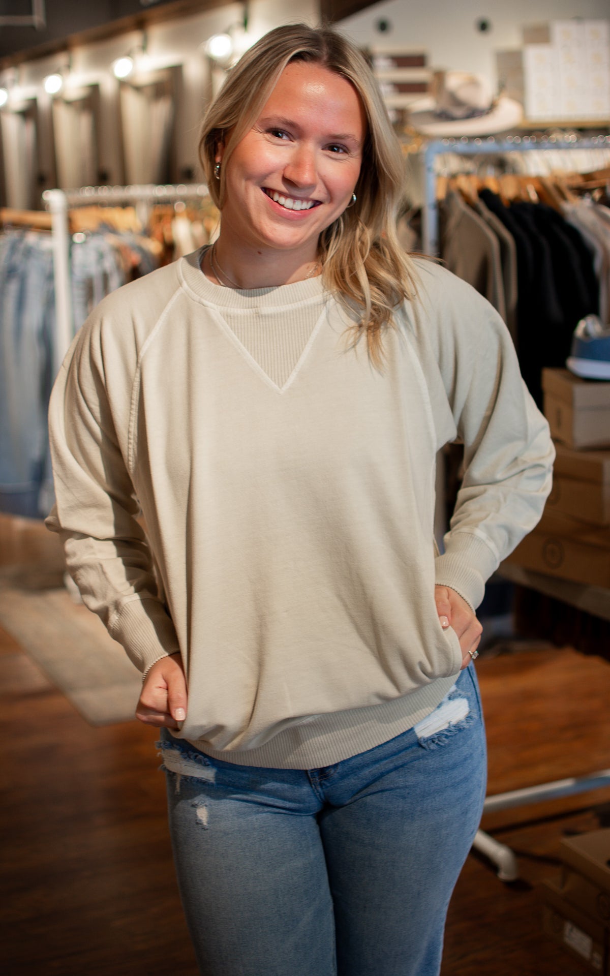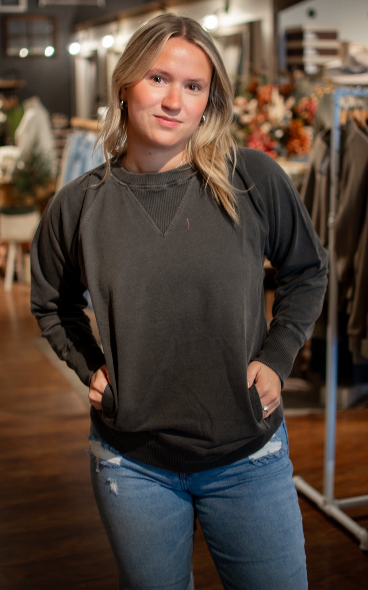 Cozy up in the Stay Behind Ribbed Sweatshirt, your new go-to for chilly days. Featuring handy pockets, ribbed side panels, and a neckline detail, it’s designed with a slight mineral wash and extra stretch for comfort and style. Perfect for lounging or layered looks, this sweatshirt brings playful ease to your wardrobe.