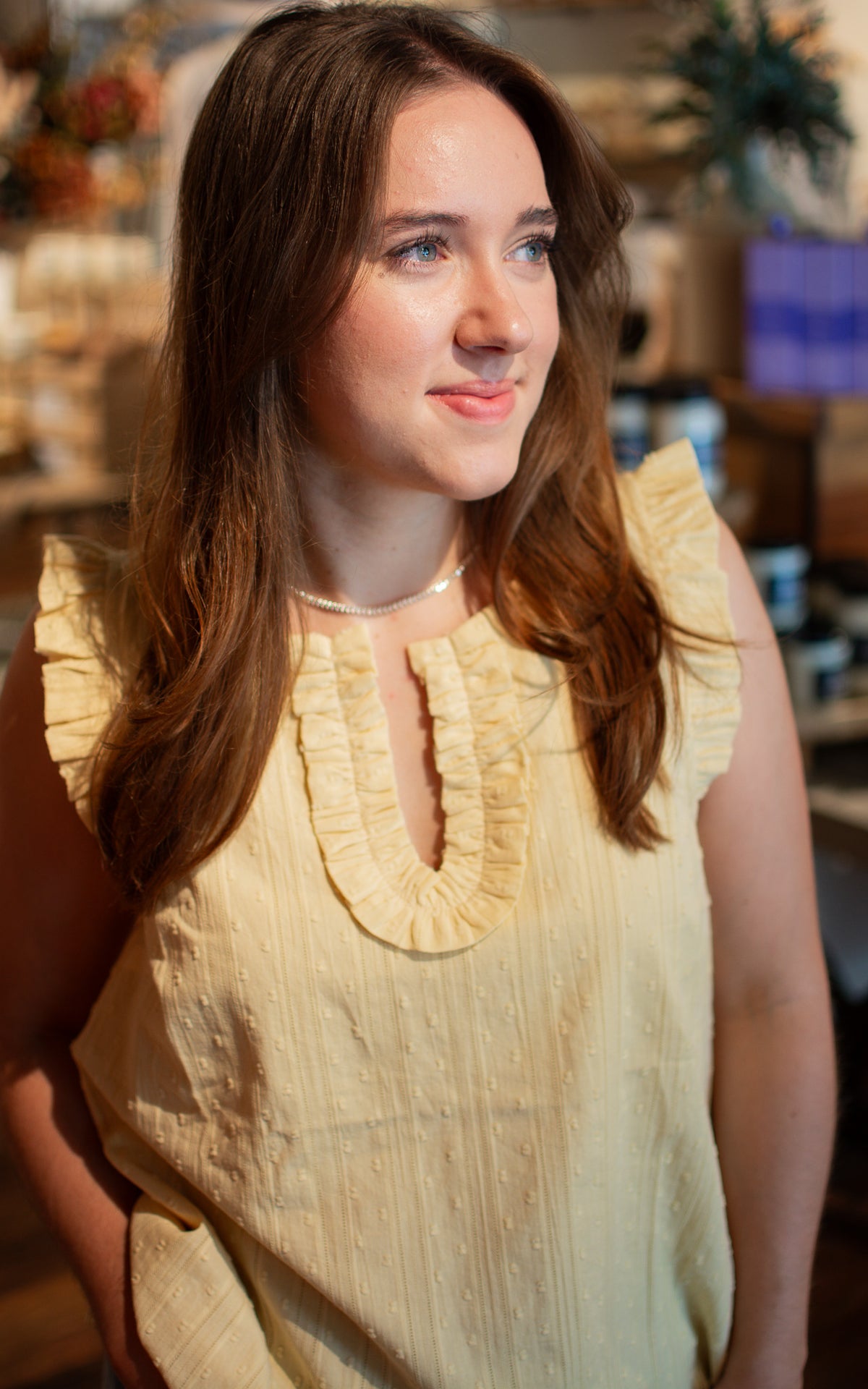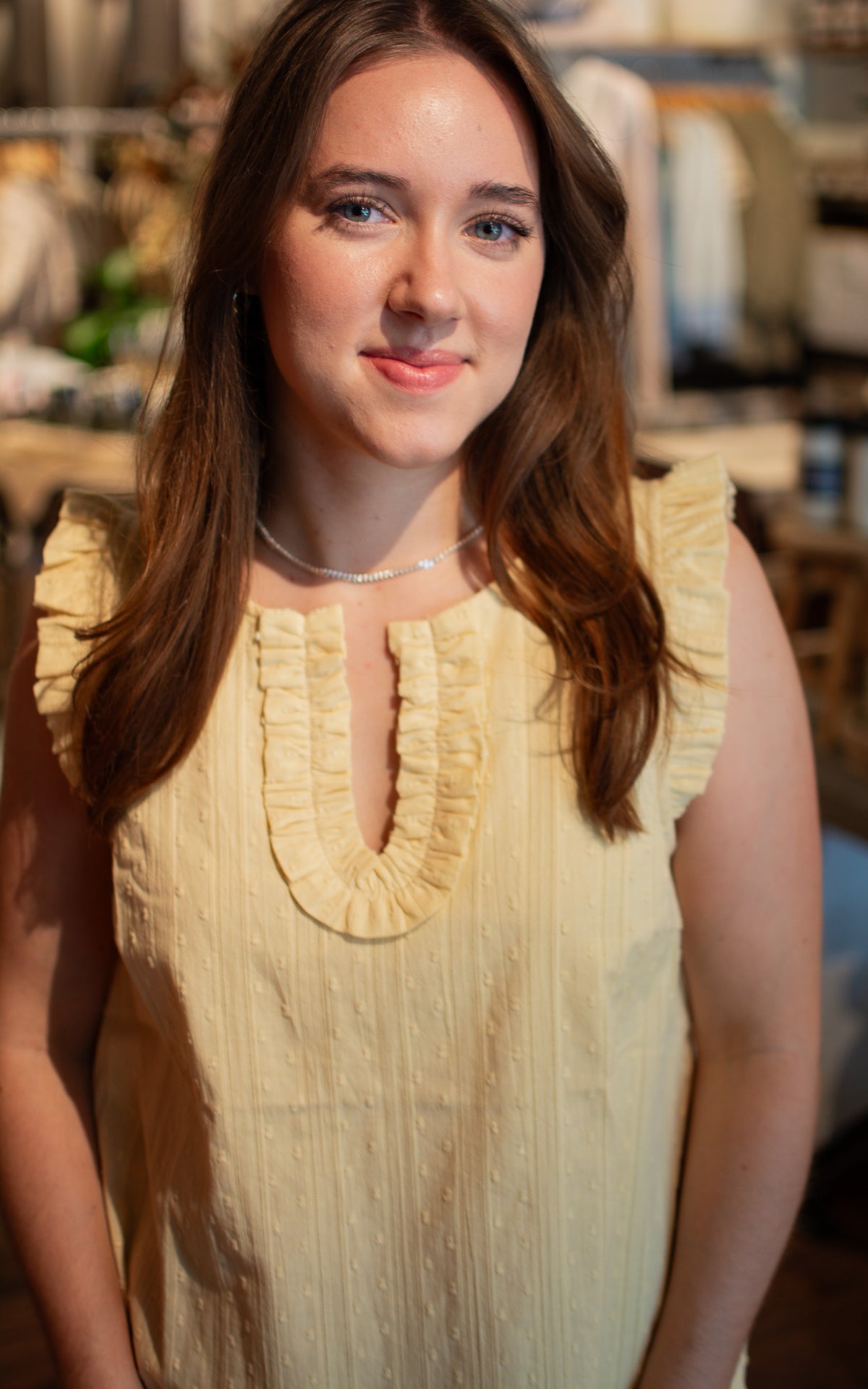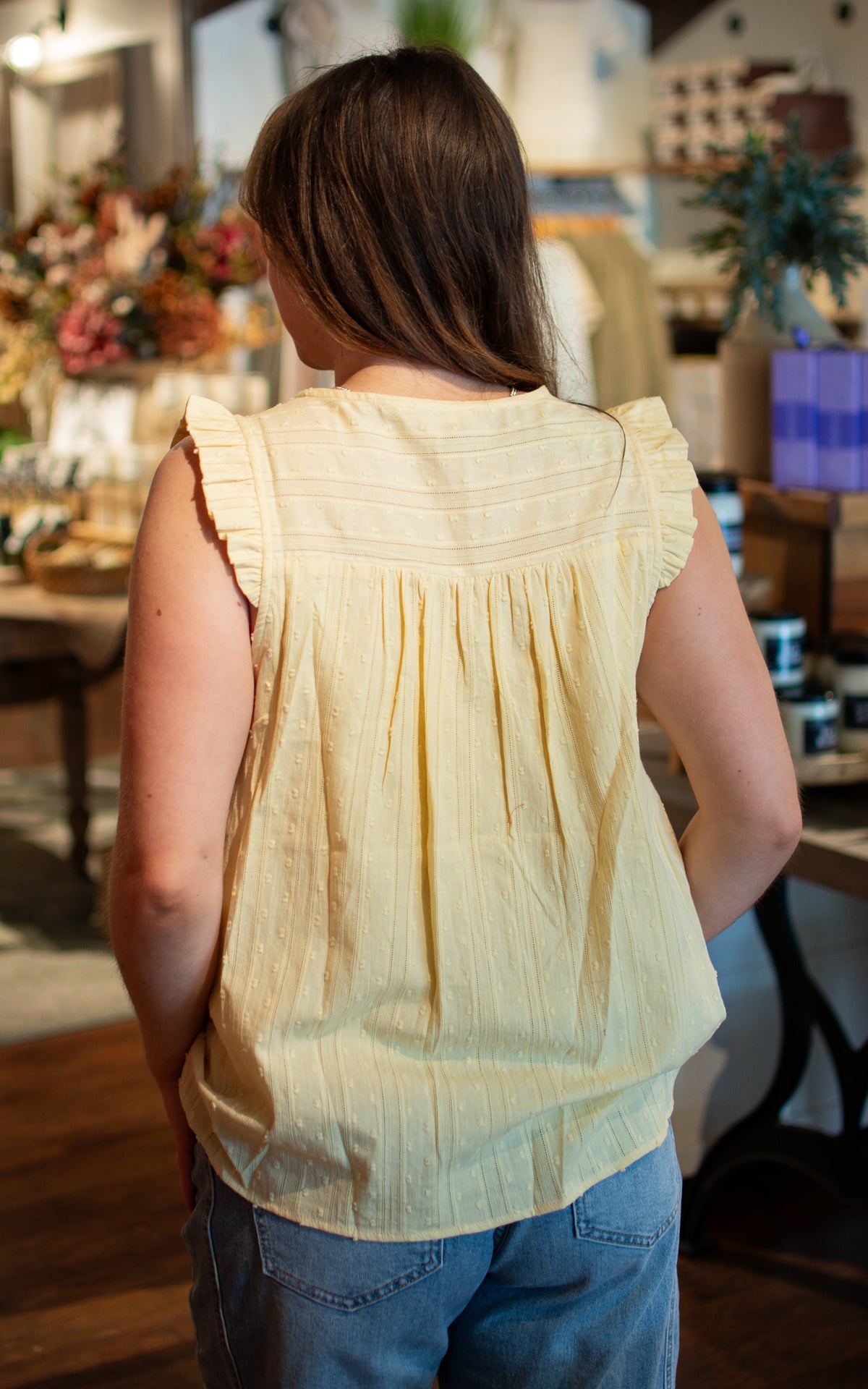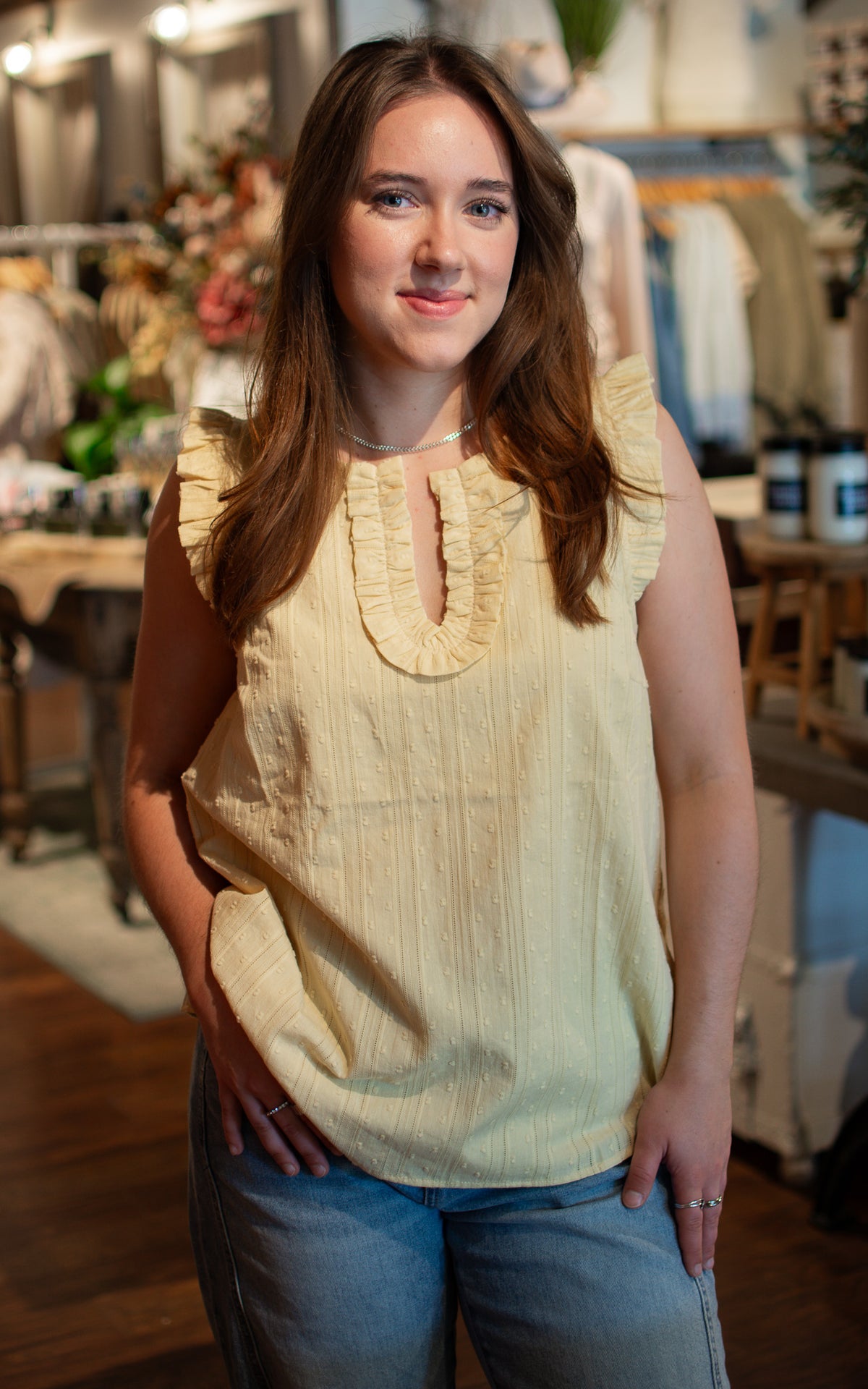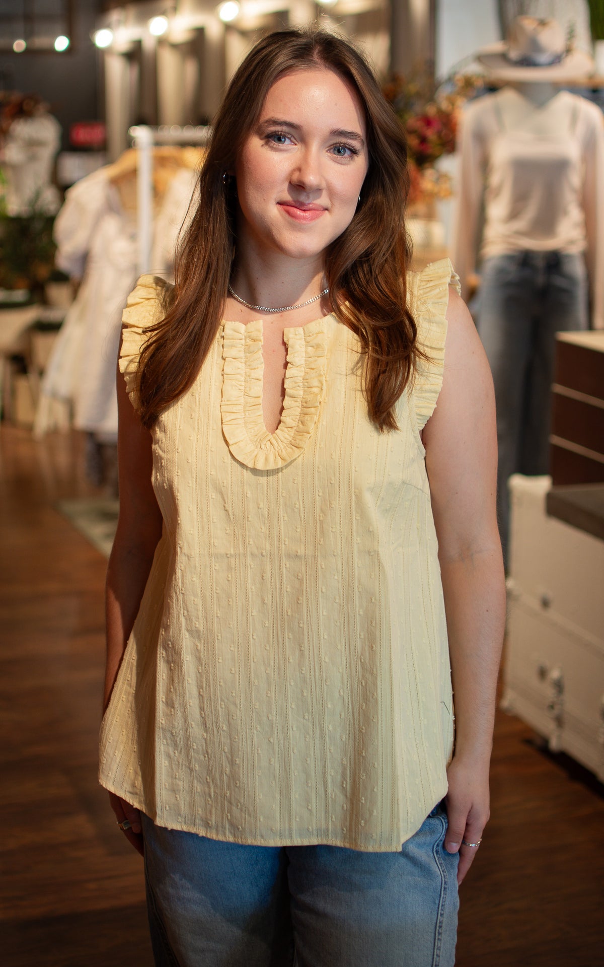 The Summer Sunrise Tank Top shines in a buttery yellow hue with timeless, classy style. Fully lined for comfort and featuring great texture and detail, this playful tank is your perfect sunny-day companion to brighten up any outfit.