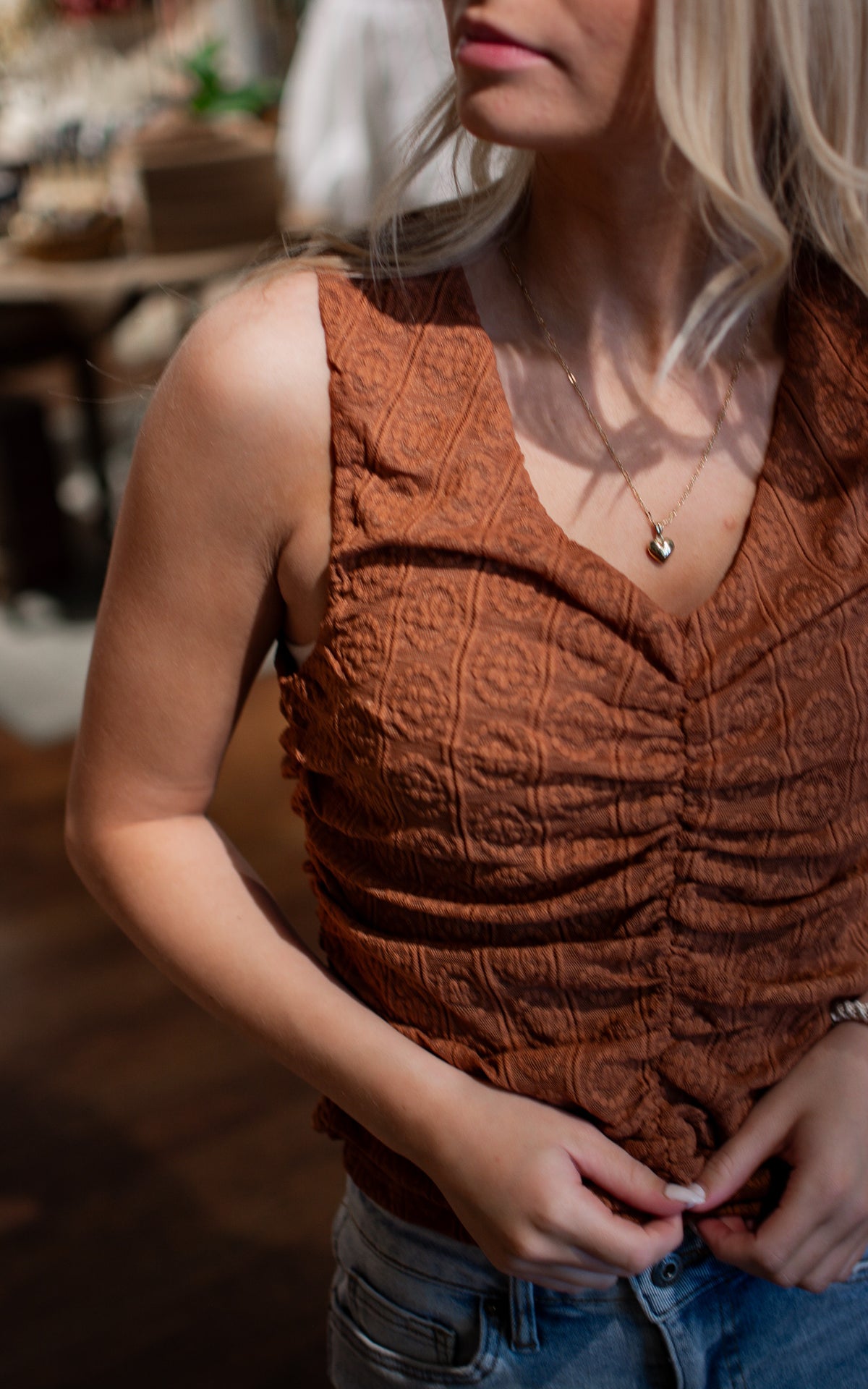 Add some character to your wardrobe with the Sunset Kisses Tank Top, featuring a playful cinch design for a flirty and flattering fit.