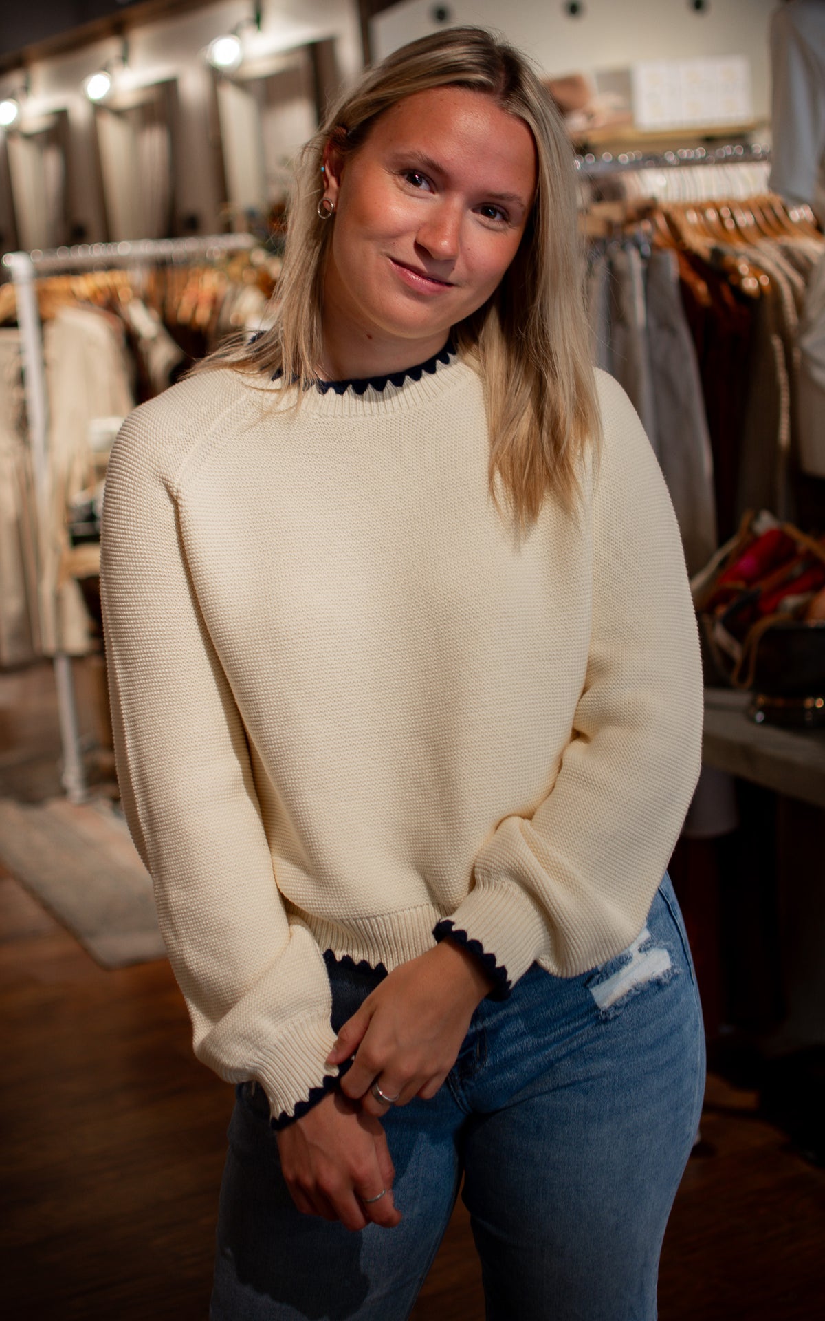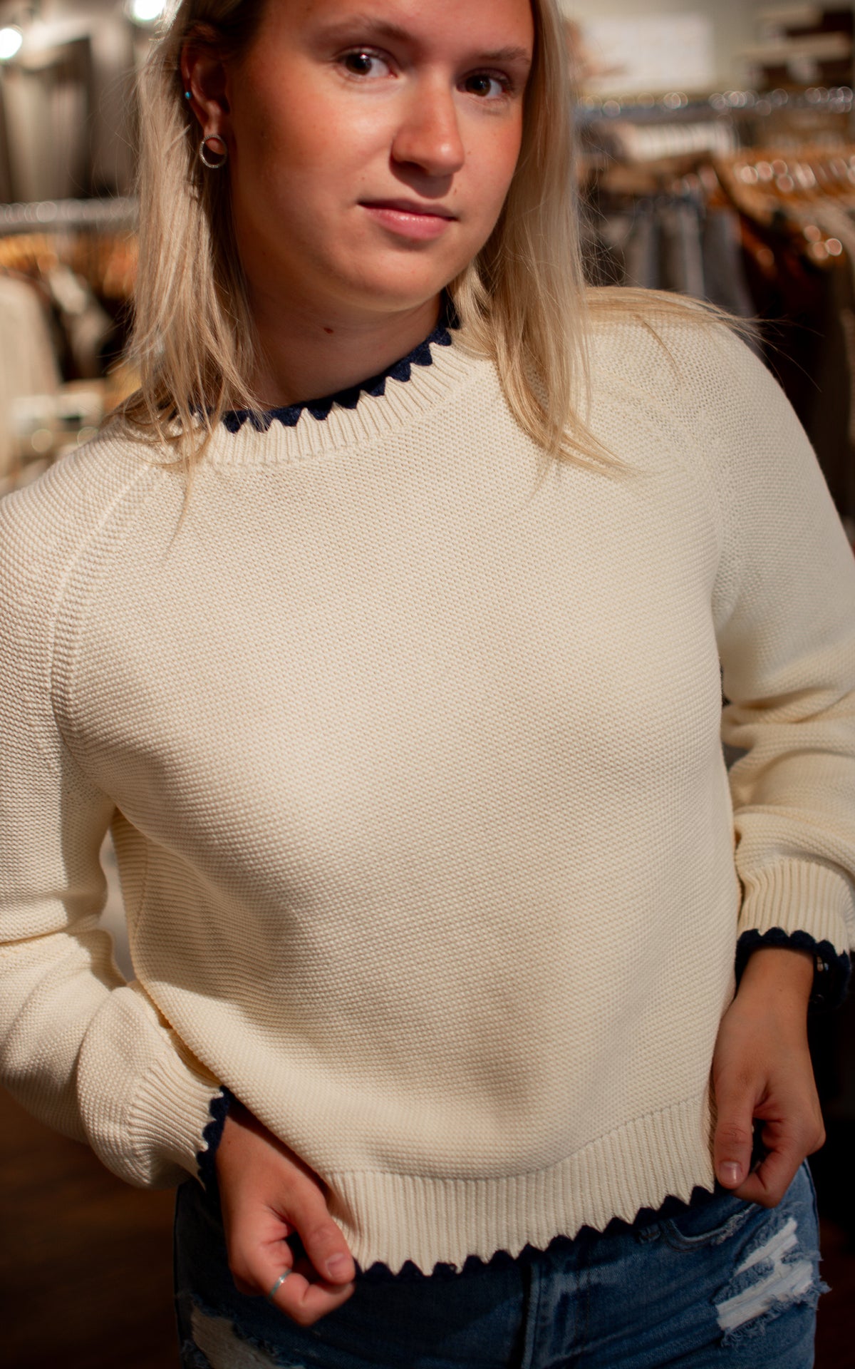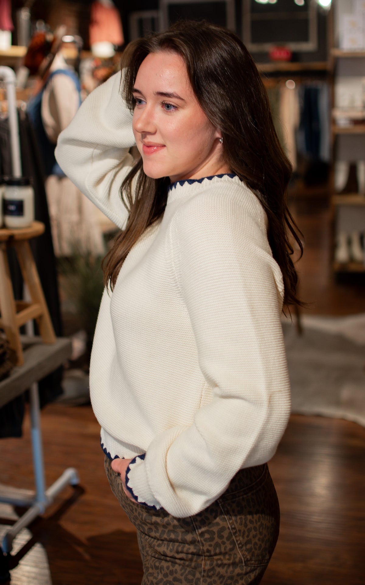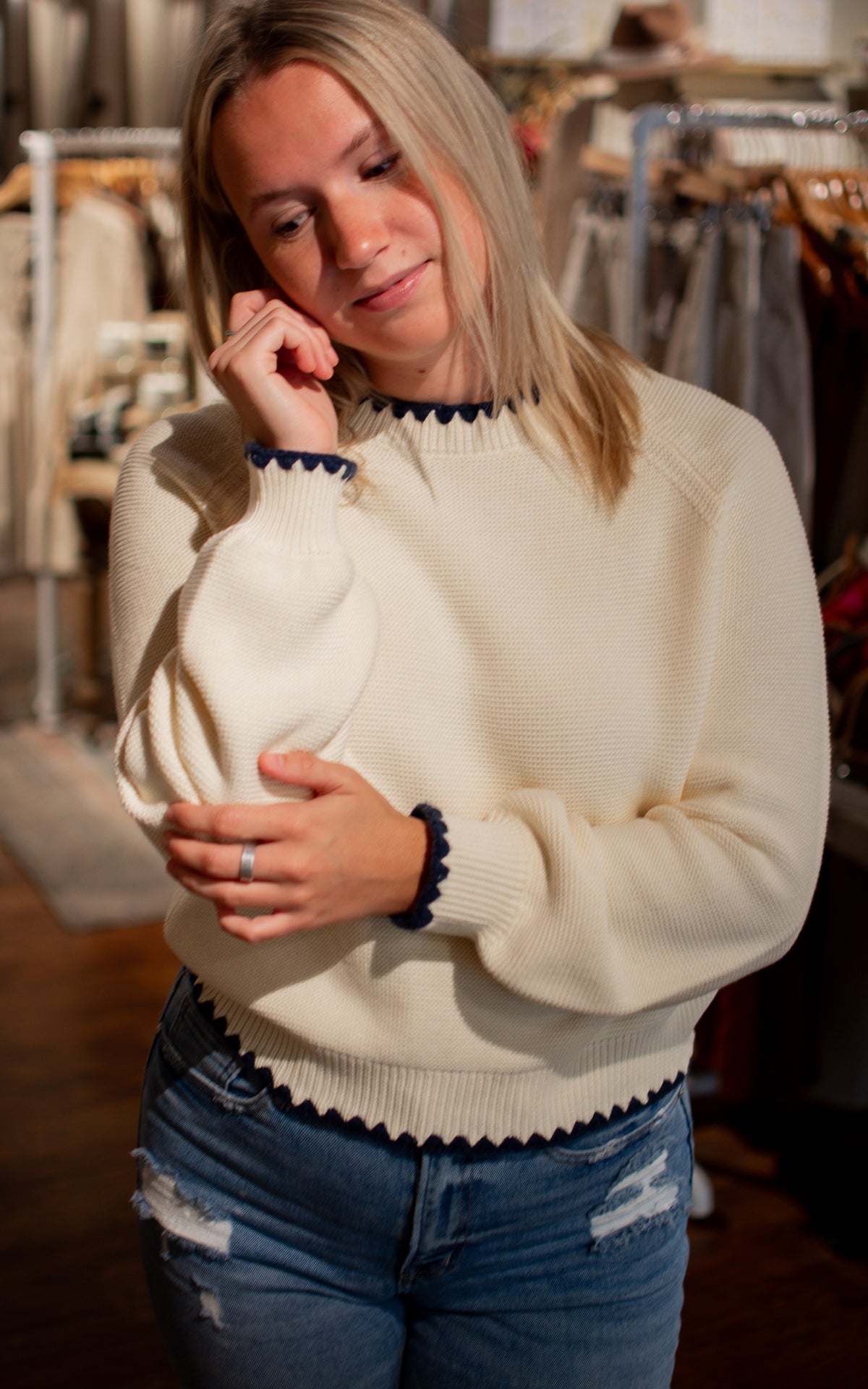 The Tillie Navy Sweater is your perfect go-to for both business meetings and cozy weekends. Its crisp white color is playfully accented with navy scallops at the neckline, hem, and cuffs, adding a charming touch to your outfit. Dress it up or down and enjoy a stylish, comfy look anytime!
