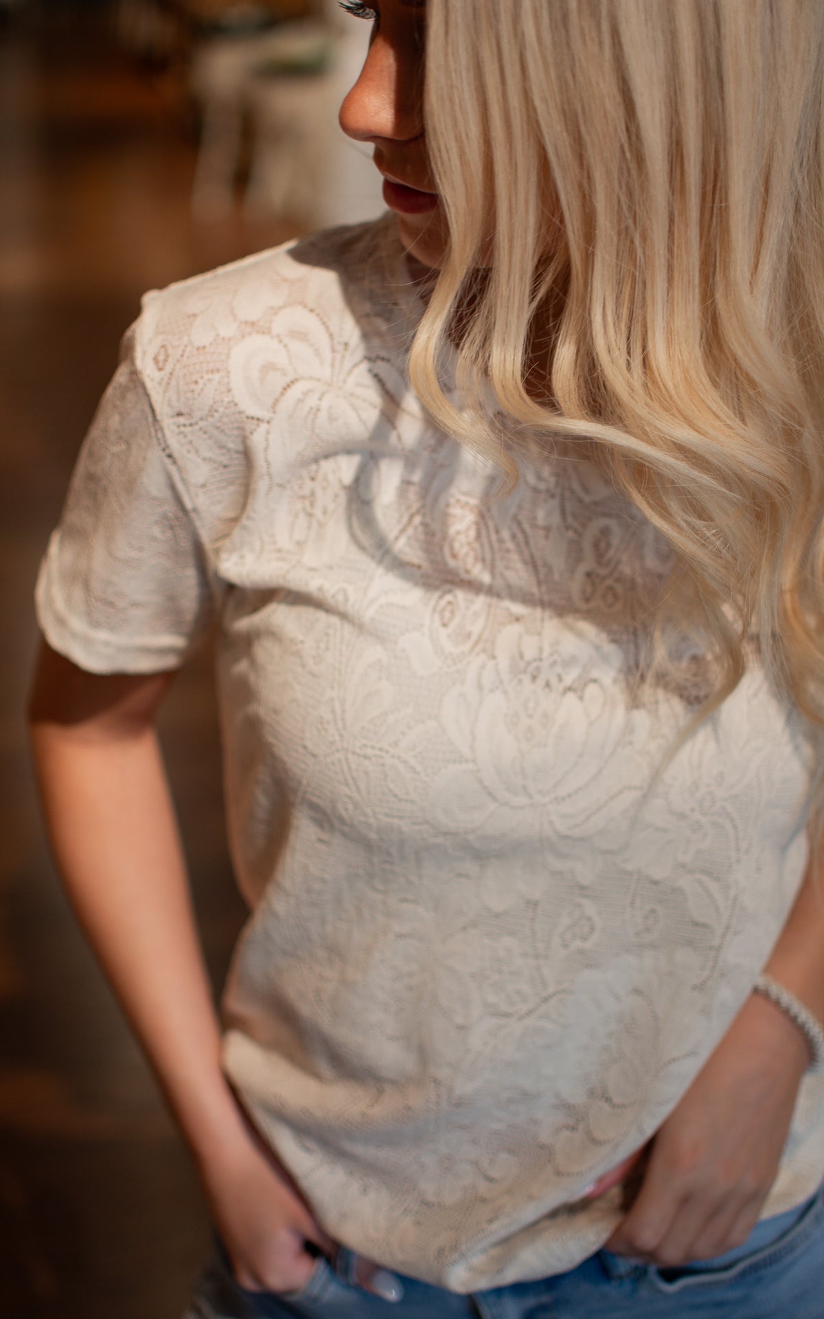 Flaunt your feminine side with our Victoria Floral Lace Tee. This cream colored tee features delicate lace detailing, adding a touch of elegance to any outfit. Perfect for a casual look that exudes sophistication.