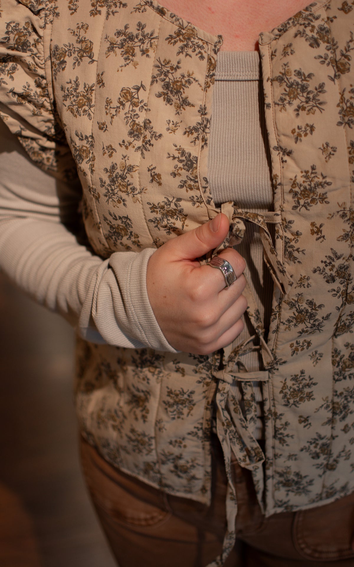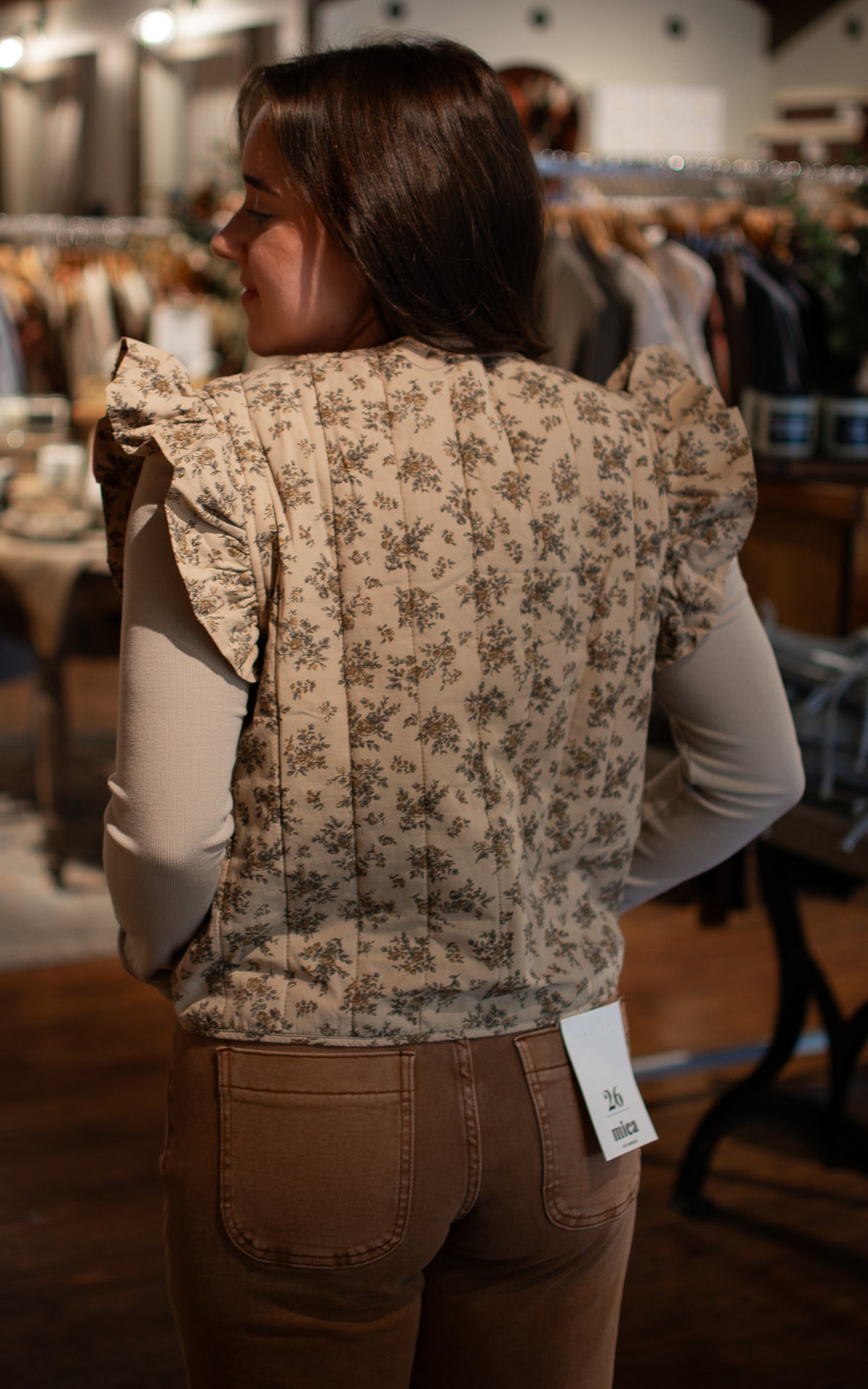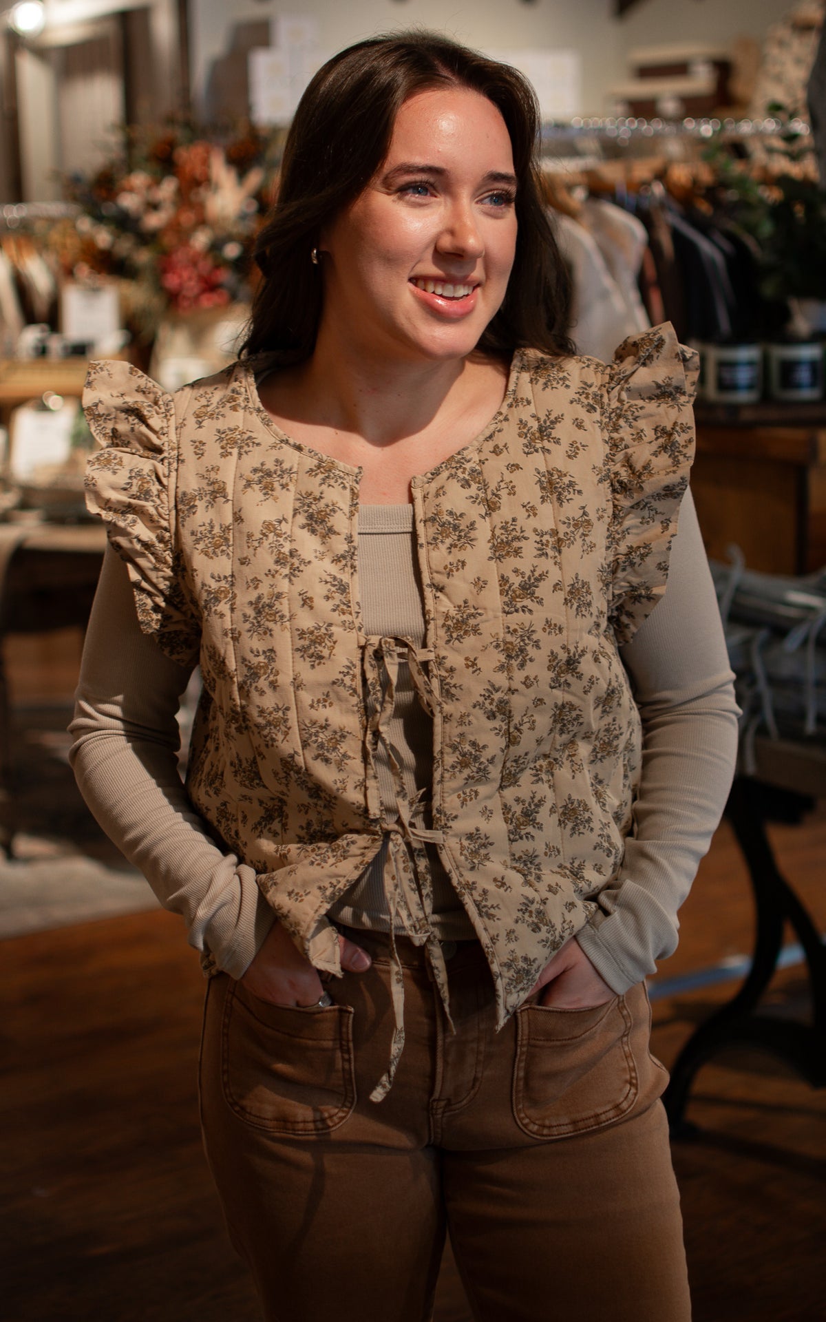 Add a playful twist to your look with the Wild West Ruffle Vest! Featuring ruffled cap sleeves and cute front tie closures, this tan floral print vest brings fun and flirty vibes to any outfit. Perfect for layering with a dash of charm and style!