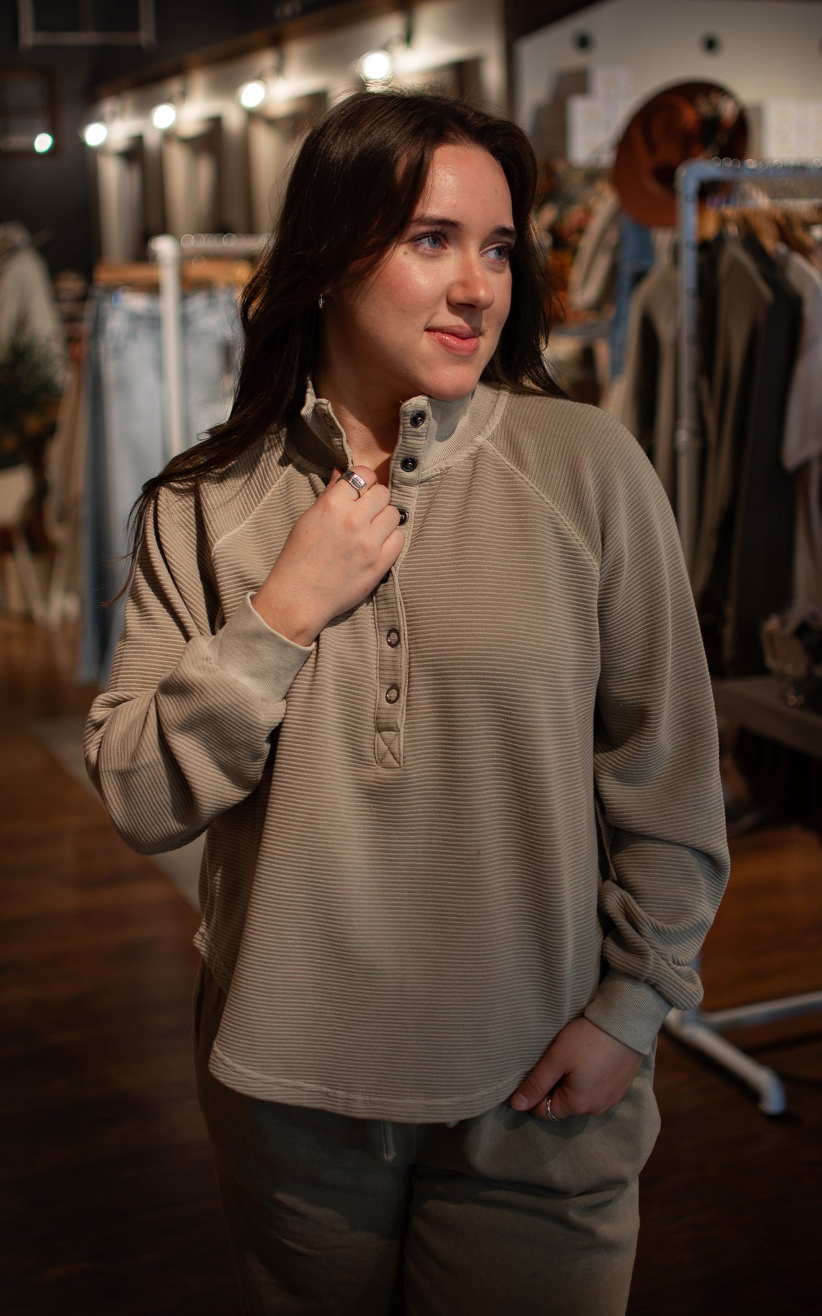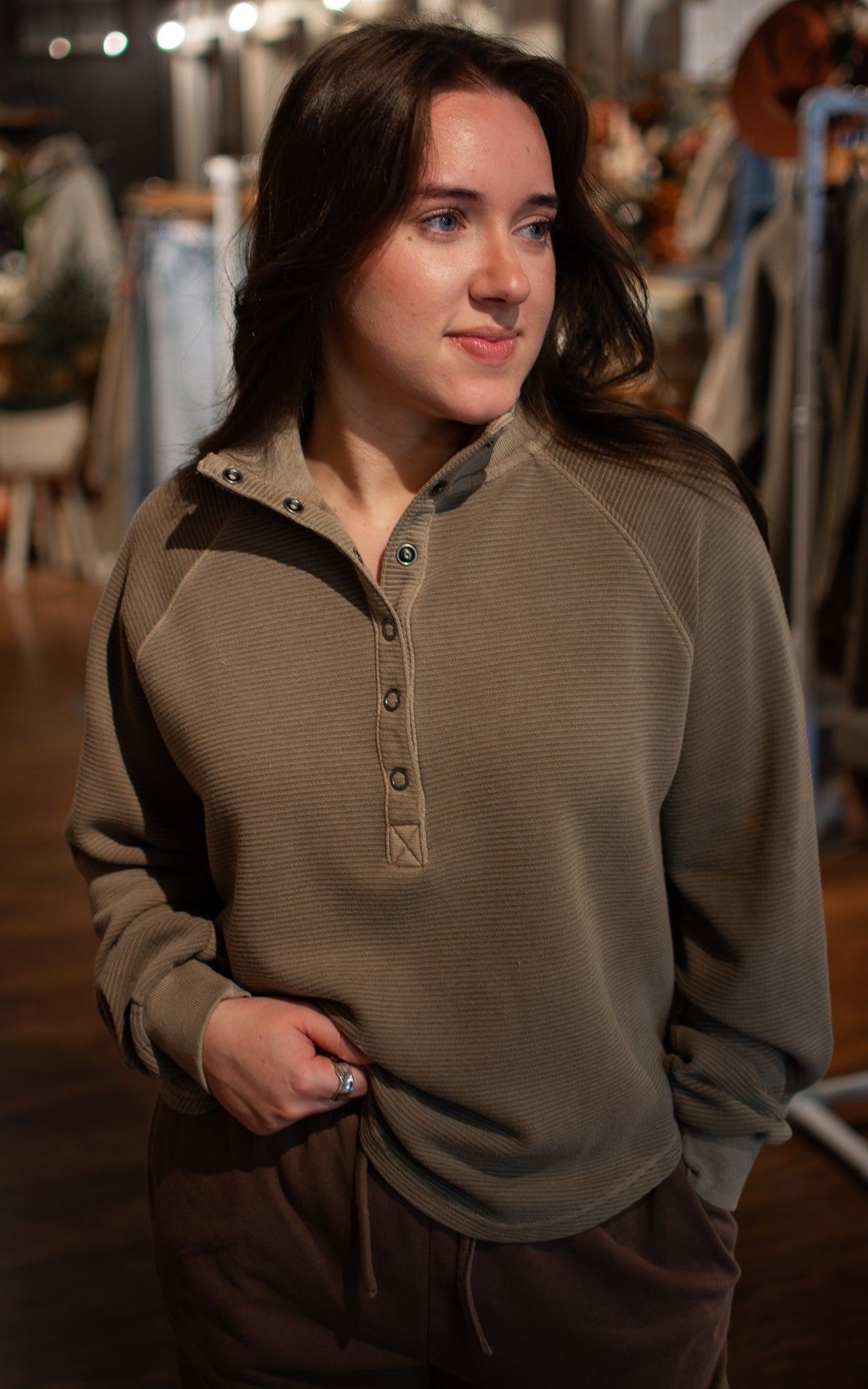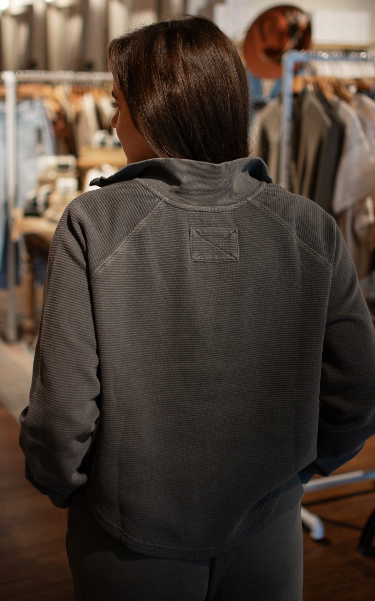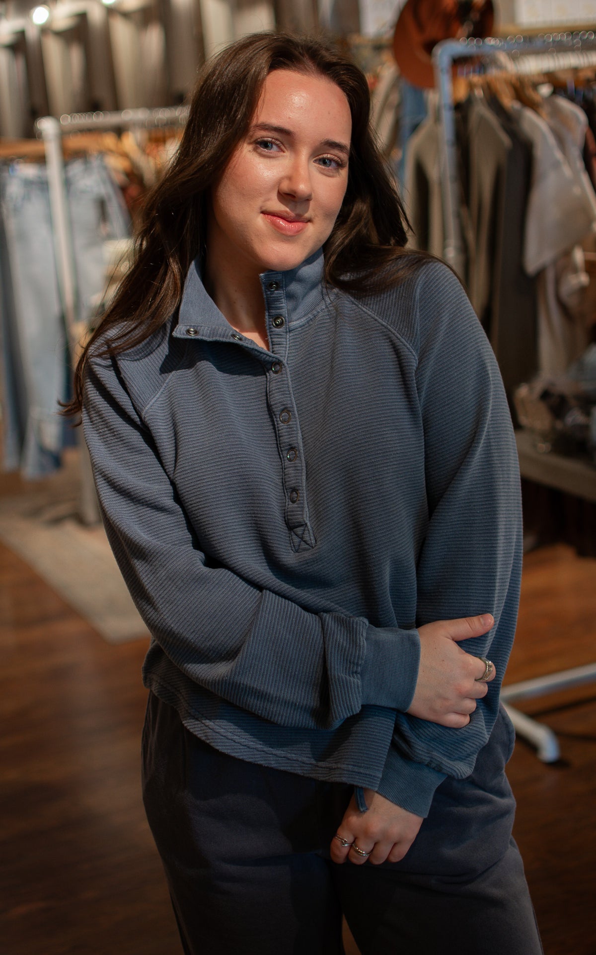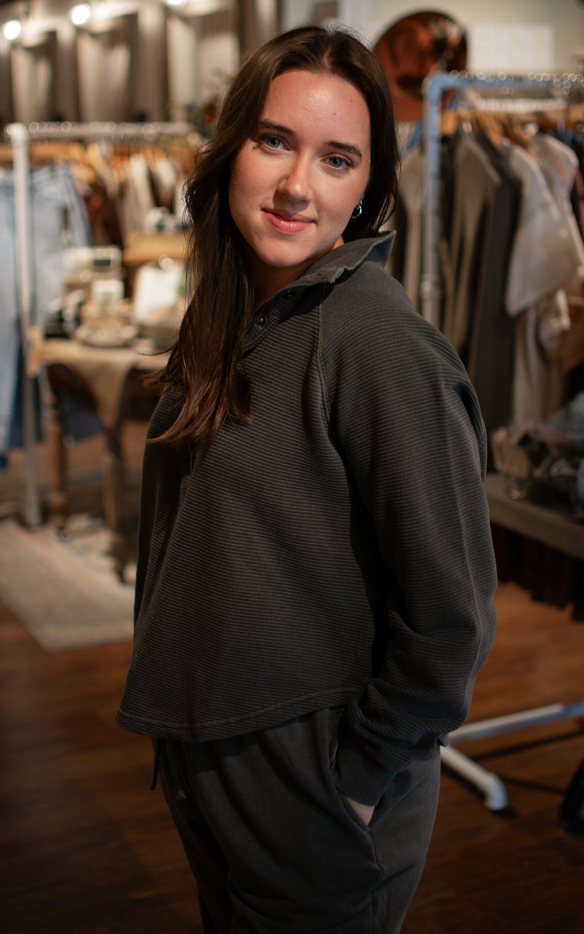 Get ready to jet off in style with this ribbed sweatshirt available in navy, charcoal, mocha, or brown. Featuring a fun 1/4 snap button detail, it’s the playful, cozy layer you’ll want for any adventure.