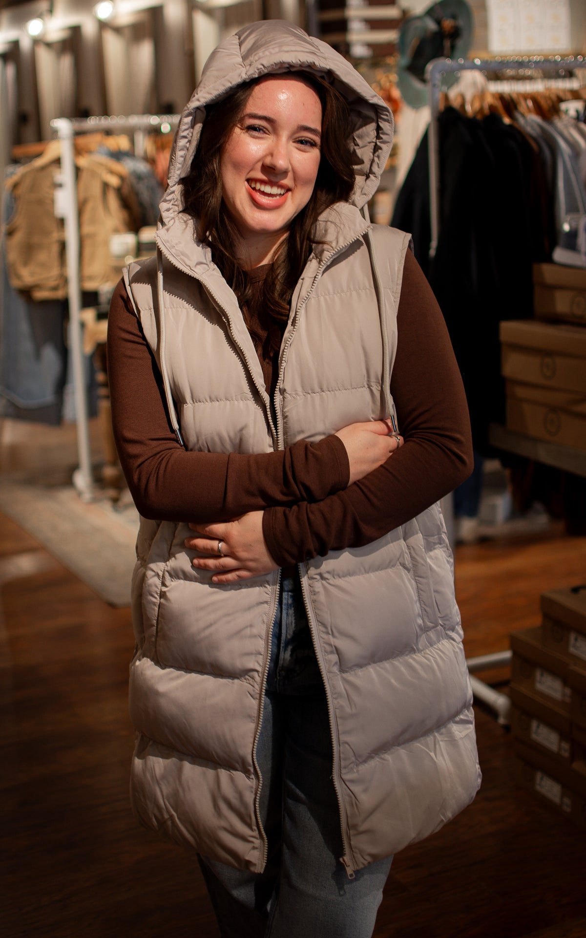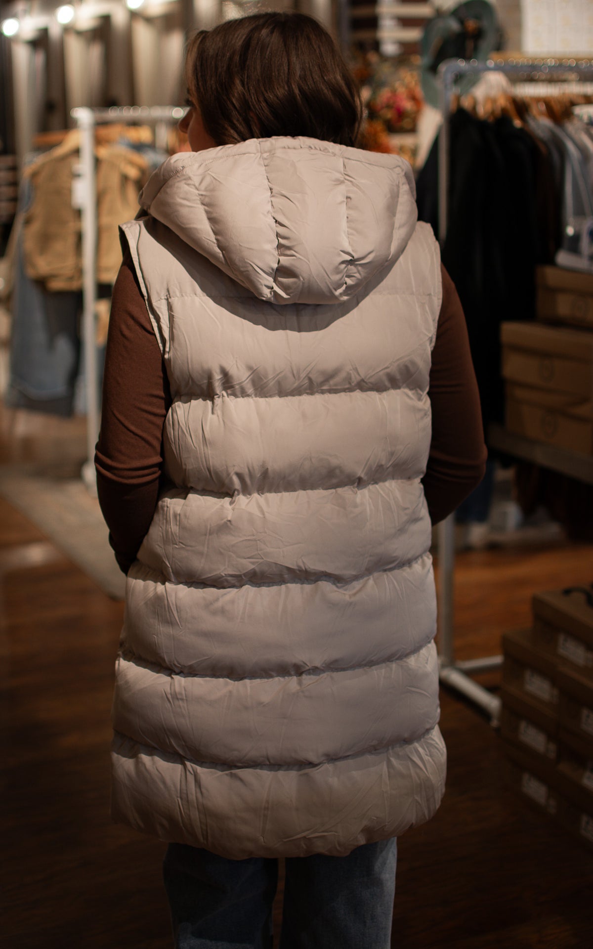 Stay cozy and stylish with the Maple Staple Puffer Vest, the ultimate mom must-have for chilly days. Whether you choose classic black or warm beige, this long puffer vest features a comfy hood to keep you snug during every school run or weekend adventure. Lightweight yet warm, it layers effortlessly over your favorite outfits, making busy days a little easier—and a lot more fashionable.